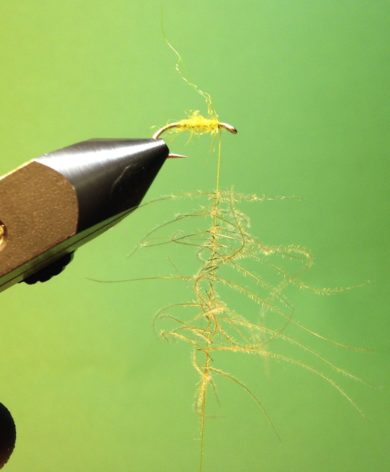 2.Bindeschritt:<br />Den Bindefaden mit Dubbingwax benetzen und diverses Dubbing an den &quot;Waxfaden&quot; anhalten und leicht andrücken. ACHTUNG Umso weniger das Dubbing um den Faden versponnen ist, desto schöner und fluffiger sieht der Körper später aus!
