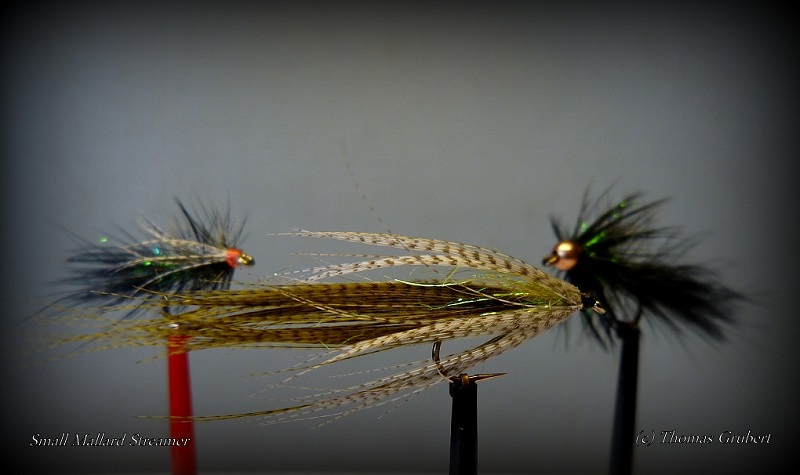 Ich habe hier noch nen kleinen Streamer. Gebunden auf nen 10er Haken, ein Bleistrang für die Schwimmlage, zwei gewundene Mallardfedern und dazwischen ein wenig Hare & Ice Dubbing ( Danke Hans :wink: )