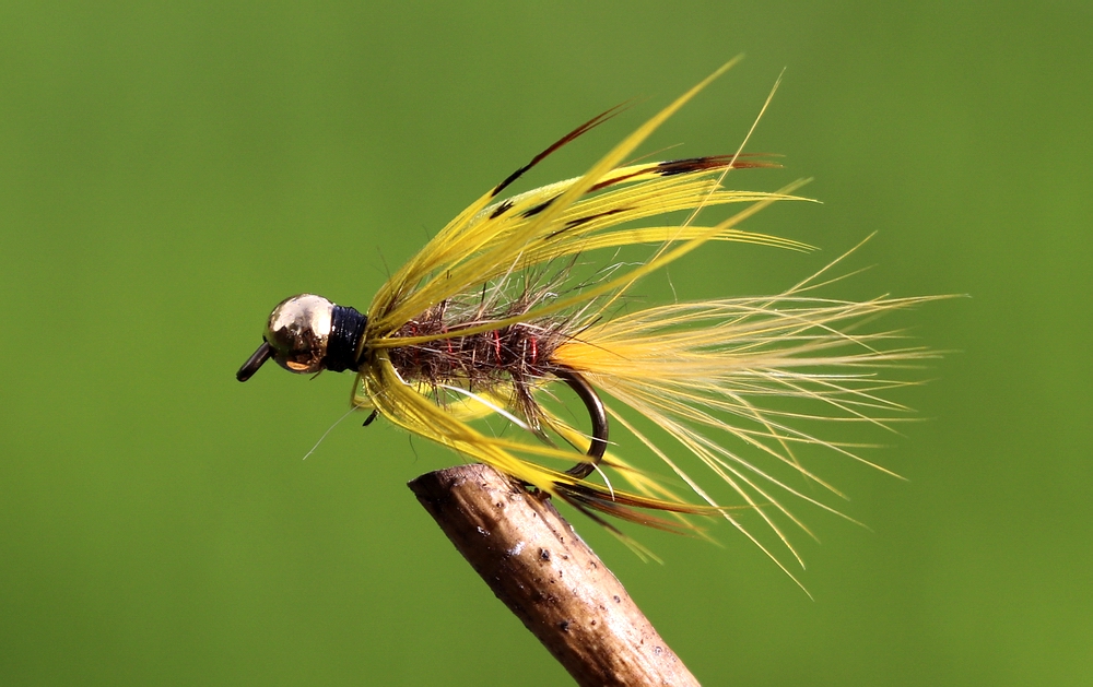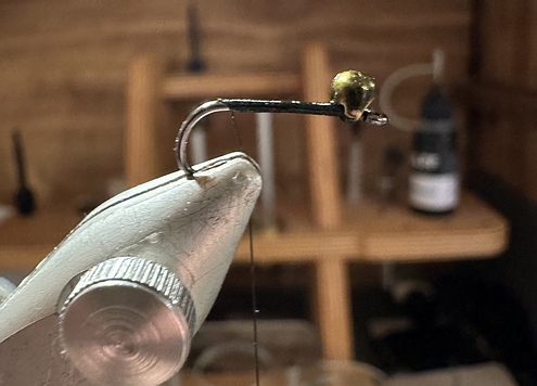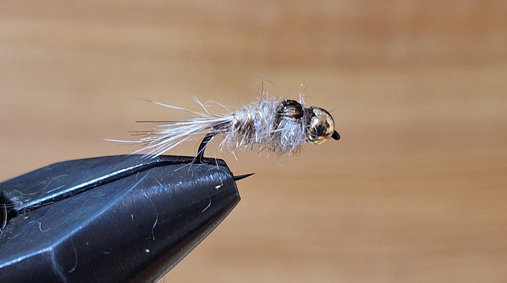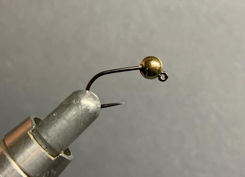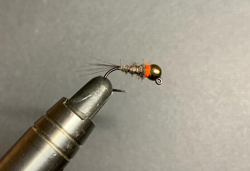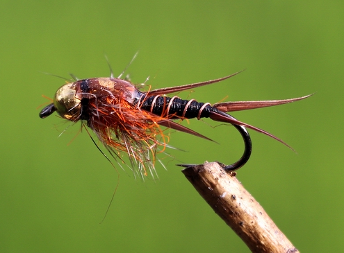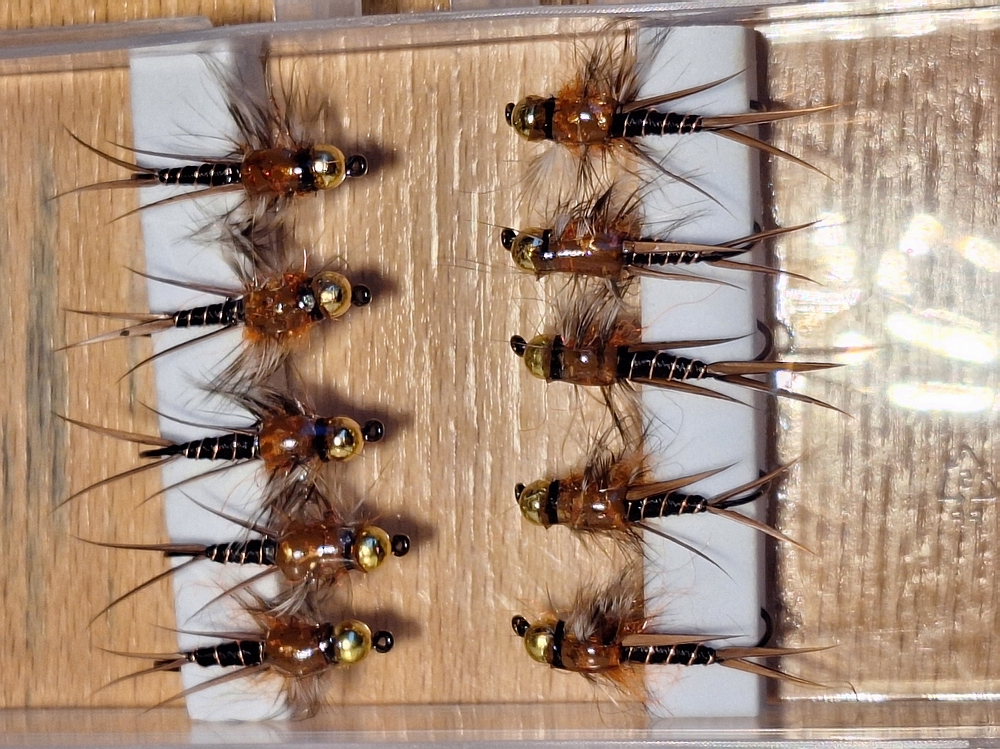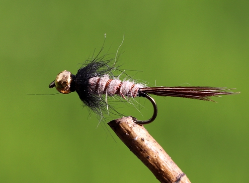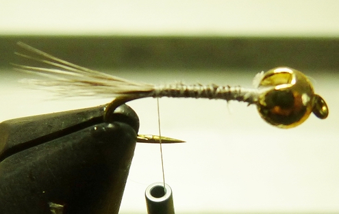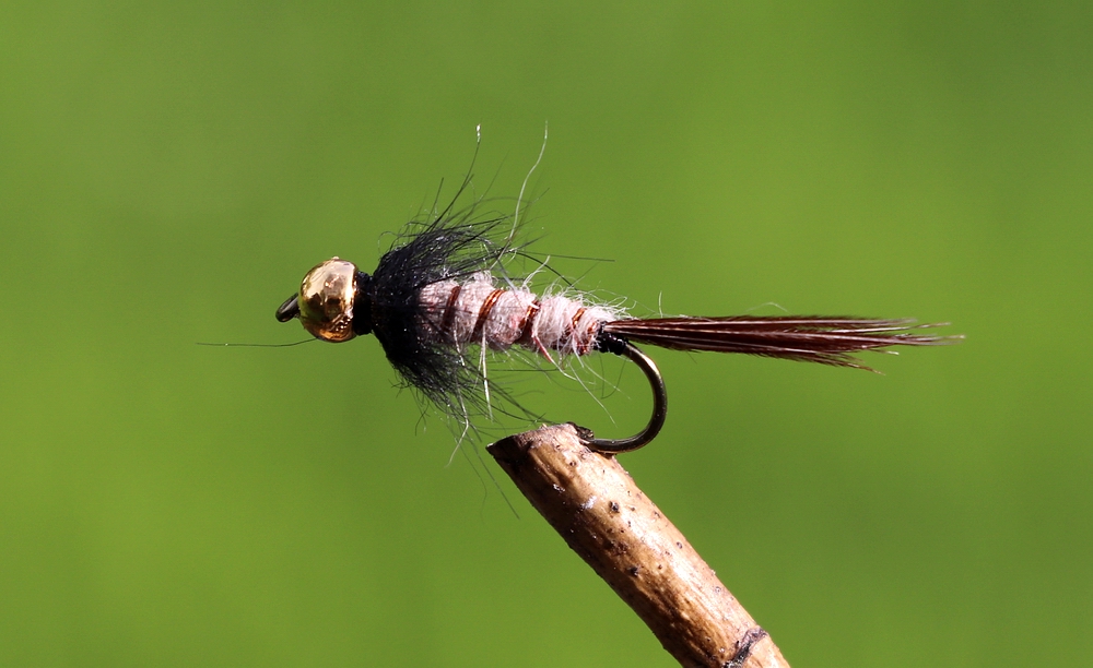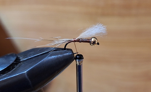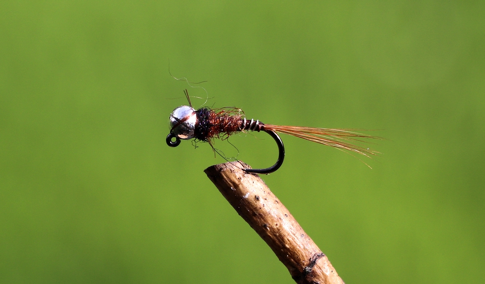 Vor Jahren traf ich einen jungen Fliegenfischer am Forellenbach, der, obwohl neu am Wasser, beim Nymphenfischen recht erfolgreich war. Er fischte eine einfache, kleine, braune Nymphe, die ich am Bindetisch kopierte. Und siehe da, im Wasser blieben mehr Forellen hängen als vorher. Im Lauf der Jahre habe ich hier und da etwas hinzugefügt, aber sie ist „die Braune“ geblieben. Warum sie das ganze Jahr über fängt, kann ich gar nicht sagen. Typisch für meinen Niederungsbach, gibt es keine besonders vorherrschende Insektenart. Sie ist also nicht speziell für eine bestimmte Situation ausgelegt. Ich fische sie mit Gold-, Kupfer- und Silberkopf. Letzterer bringt auf die Jahre gesehen gefühlt mehr Fänge als die anderen Farben, egal, wie die Bedingungen vor Ort sind. Material: