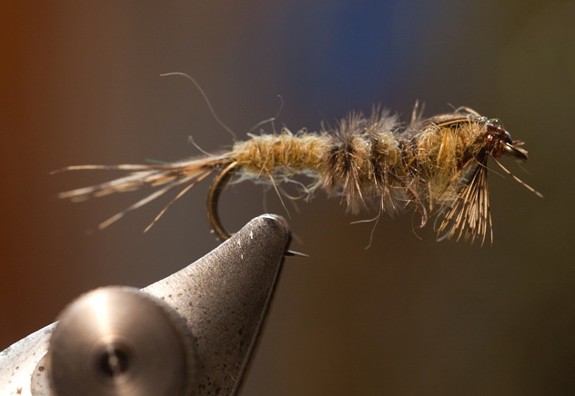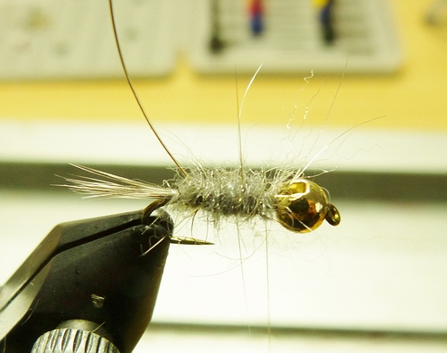 Je nach Gewässer findet die Nymphe in der Größe 6 bis 12 ihren Platz in vielen Fliegendosen. Der Urvater dieser Nymphe ist der vielen bekannte Fliegenbinder Rene Föllmi aus der Schweiz. Er bevorzugte, im Gegensatz zu meinem Dubbing aus Kaninchenhaaren, ein Dubbing aus der Unterwolle vom Seehund. Auch beim Körper wendete er die Schlaufentechnik an. Hier zwirne ich nur das Dubbing um den Faden. Neben unserer Forelle konnte ich in der Vergangenheit auch Barben und Nasen von meinem Muster überzeugen. Materialien