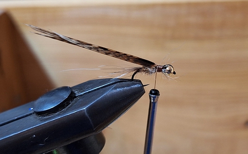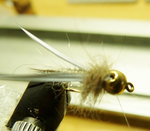 Haken #12 Messingperle 0,15 Bleidraht Feiner Kupferdraht Pfauenfiber Scudback in schwarz Holotinsel Biots in Braun Bindefaden in Braun oder Schwarz Partidge Feder in V Form gebracht UV Resin Bindeanleitung: