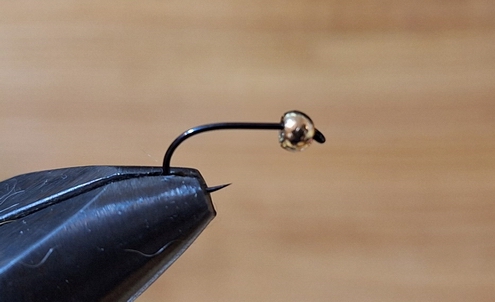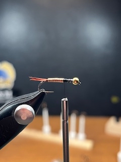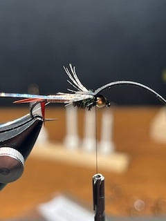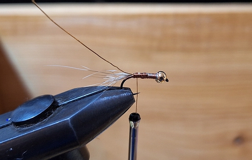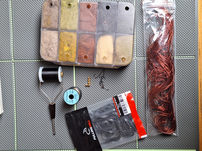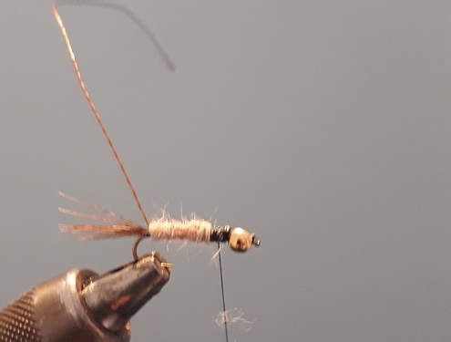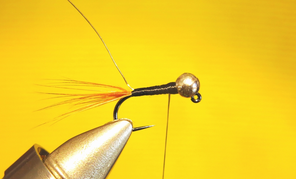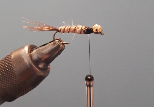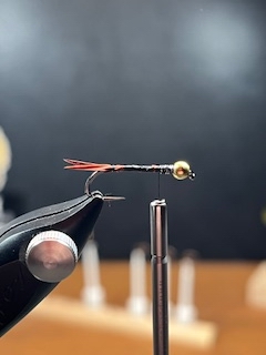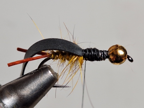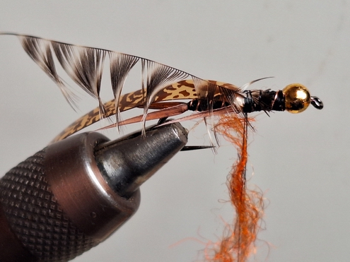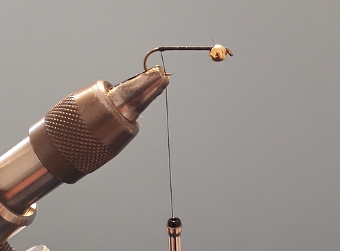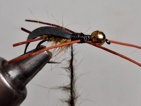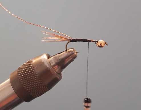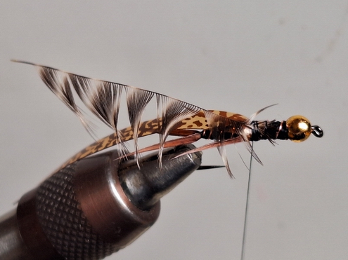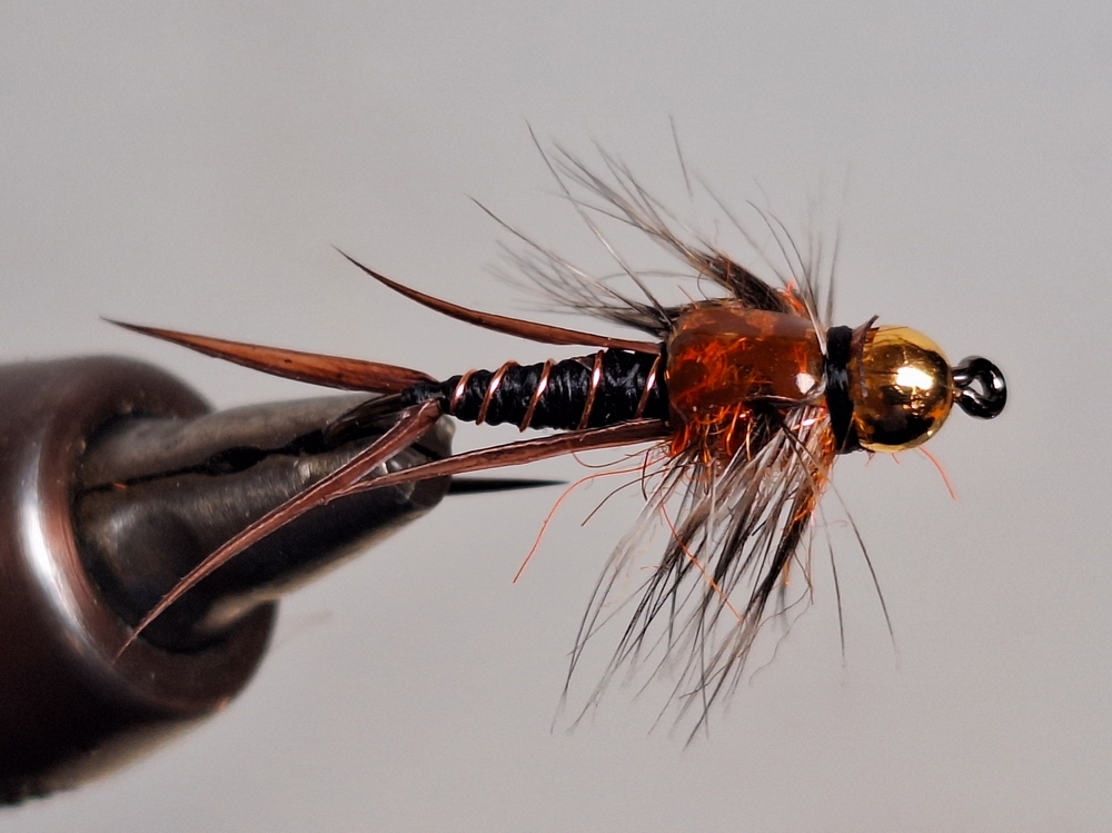 Haken: # 8-10 Bindefaden: hier Schwarz; VEEVUS 10/0 Kopfperle: Tungsten, geschlitzt, Gold, 4,0 (Baker) Ggf. Beschwerung: Bleidraht Schwanz: Biot, braun Dubbing: UV Unibody Dub (von Baker) Hinterkörper: UNI Stretch; schwarz Rippung: Kupferdraht Hechel: Henne Flügelhülle: Marbled Latex (Heger) oder Nyph-Rap, 3 mm, Fulling Mill oder ähnliches Bindeanleitung: