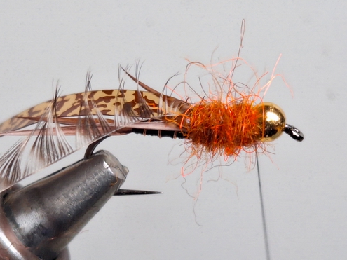 - Jig-Haken Grösse 12 - Tungstenperle 4 mm - GSP Faden weiss - Sekundenkleber - Grannen von Huhnfeder für Schwänzchen - Kupferdraht für Rippung - Hareline Krystal Dub für Körper - Neon-Orange Faden für Kragen Bindeschritte: |