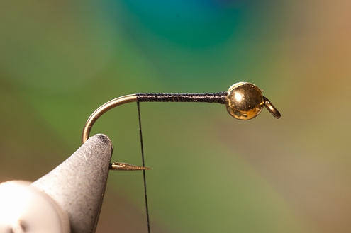 | 1. Kopfperle auf den Haken stecken | 2. Bleiwicklung aufbringen, mit Bindefaden überwinden und Grannen als Schwänzchen einbinden |