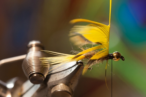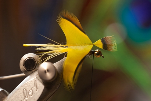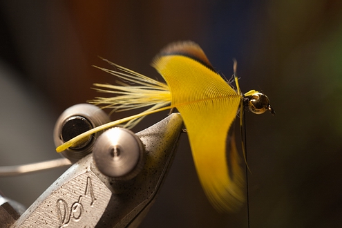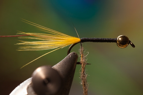 | Grundwicklung legen | Recht viele Fiebern einer gelben Hennenfeder zusammen mit dem Kupferdraht als langes Schwänzchen einbinden |