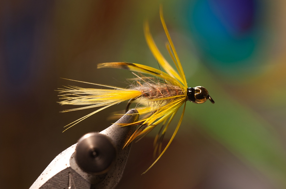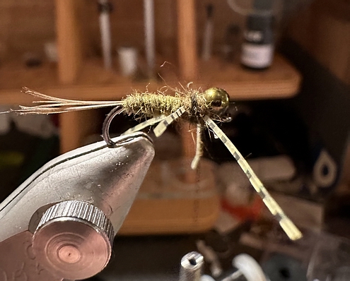 Im Frühjahr sollte man sie größer und schwerer binden als im Herbst - hier meine besonders schwere Version mit Tungsten-Nymphe und Drahtbeschwerung. Material: