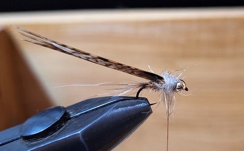 | (7) Nun wird die vorbereitete Partridge Feder so eingebunden, ... | ... dass die Fibern rechts und links abstehen und die Beinchen bilden. Überstand wieder so knapp es geht abschneiden und die Fliege abschließen. | (8) Zu guter letzt eine Schicht UV Resin auf den Thorax auftragen und aushärten. Dabei darauf achten, das Harz auch auf den Draht als auch auf die Perle zu verteilen, da sich die Schicht nicht gut mit dem Latex des Scudback verbinden kann. |