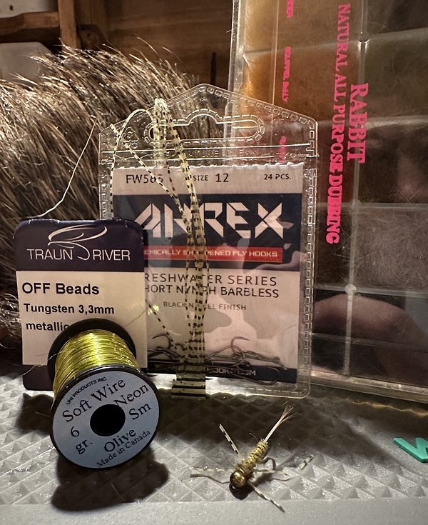 100 Den. Garn Semperfli Ahrex Haken Traditionell Nymph Gr. 8-14 Off Bead 2,8-3,3 TraunRiver Dubbing Hase, versch. Farben am besten 2-3 Mischen. Dunkel Oliv, Grün, Braun Rubberlegs, Grün/Schwarz Rippung: Softwire Neon / SM Schwänzchen: 2-3 Wildschwein Borsten Bindeanleitung:
