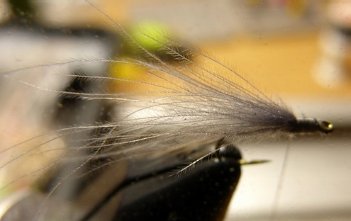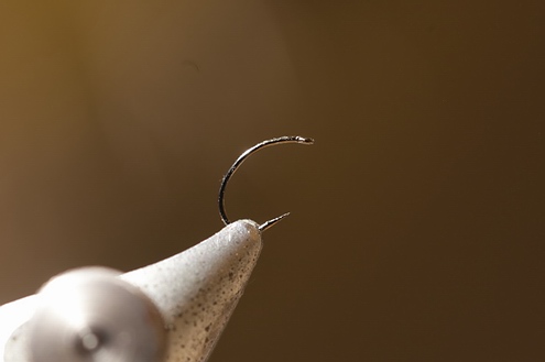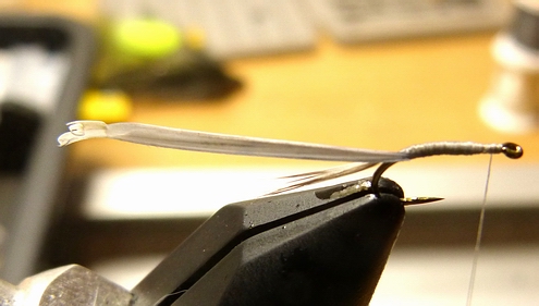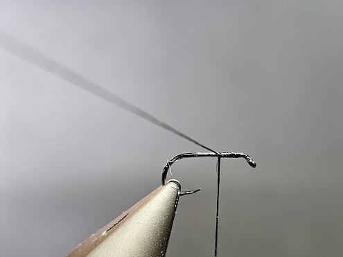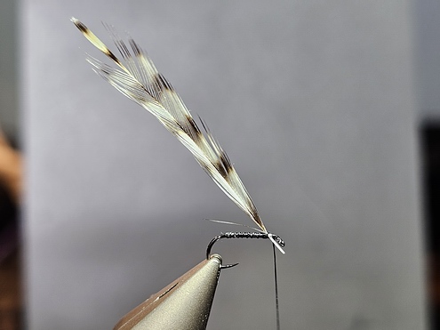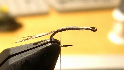 hellgrauen Faden, hier ein TRP in 8/0 angelegt. Einige Fibern einer größeren Grizzly-Hahnenhechel werden als Schwänzchen bis zum Beginn des Hakenbogens eingebunden. |