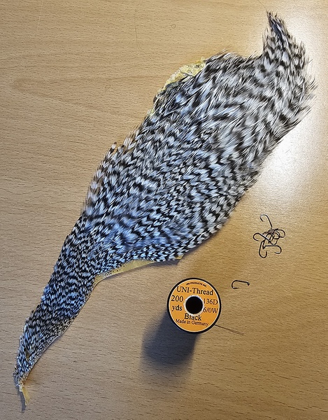 Benötigte Bindematerialien sind: - ein Hechelbalg in der gewünschten Farbe - schwarzer Bindefaden. Bspw. Uni 6/0 oder 8/0 mit dem sich gut eine Körperrippung erstellen lässt - Trockenfliegenhaken in der gewünschten Größe (hier #1) Bindeanleitung: