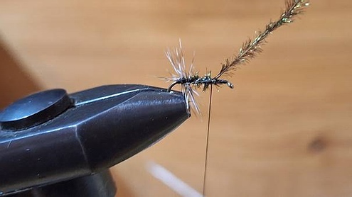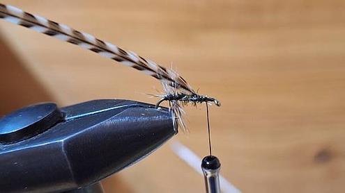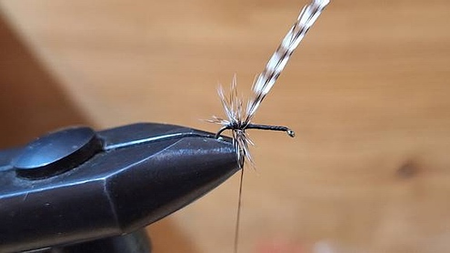 | (5) Rippung der Fliege mit rundem Faden erstellen. | (6) Hechel in gewünschter Farbe vorbereiten. Das Schöne an dieser Fliege ist, dass vermeintlich zu große Federn für die genutzte Hakengröße ohne Probleme verarbeitet werden können. |
