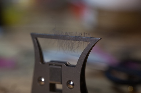 | Eine halbe grauen CDC Feder in der Materialklemme