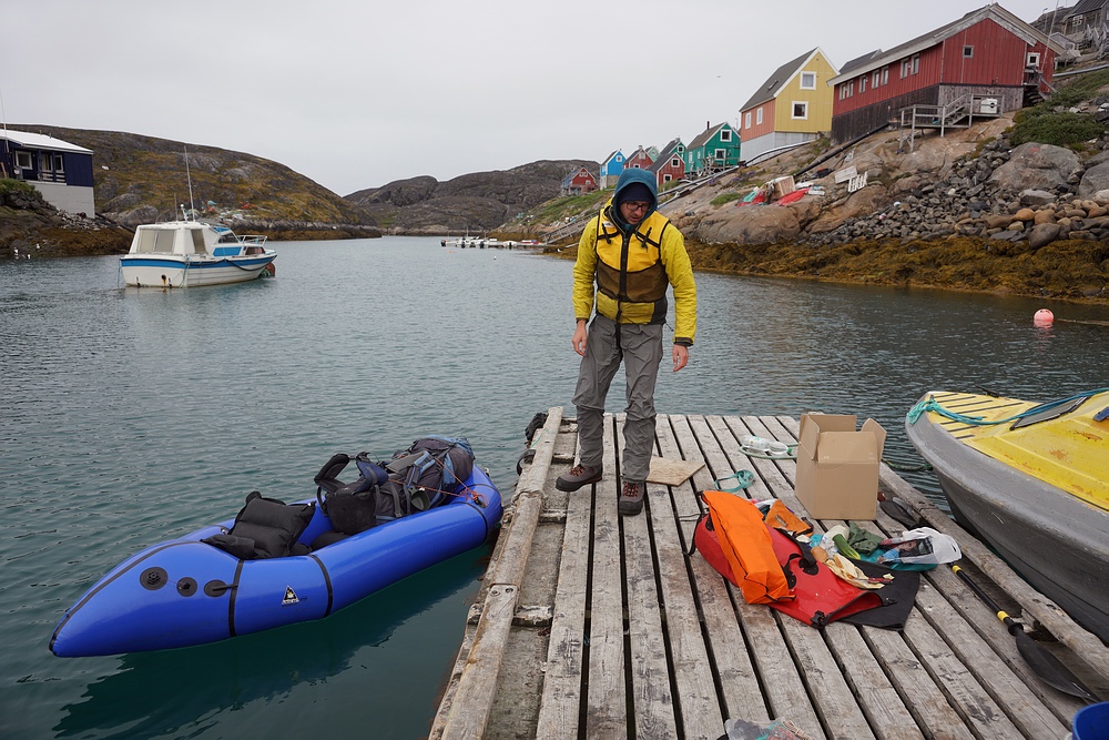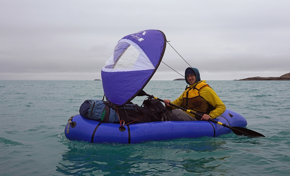 | Packrafts sind gewichtsoptimierte Mini-Schlauchboote, daher auch sehr kurz und folglich laufen sie nur recht langsam. Um eine gewisse Beschleunigung der langen Flachwasserpassagen in den Fjorden zu erreichen, haben wir uns „Packsails“ besorgt, die wir hier erstmals einsetzen wollen. Das sind leichte, klein verpackbare Segel, die aufgeklappt werden können und dann einen Durchmesser von in unserem Fall 1,20 m aufweisen. Packrafting mit Packsail macht also auf neudeutsch „Packsailing“. Um mit einem so kurzen Rumpf und so kleinen Segel nennenswerte Geschwindigkeiten zu erreichen, sind schon höhere Windstärken erforderlich, aber starke Winde sollte es auf Grönland ja genug geben. Wir hoffen eher, dass sie nicht zu stark sein würden! |