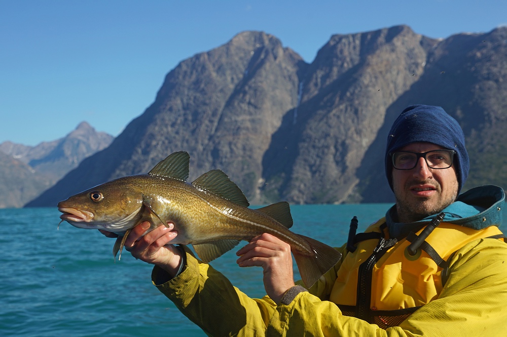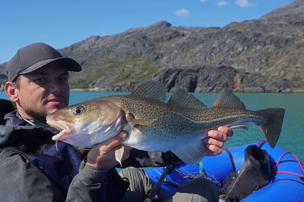| Der erste Lagerplatz der Reise liegt in einer Bucht, wo wir erste Fischereiversuche starten. Mit der Fliege und mit Spinnzeug vom Ufer aus leider ohne Erfolg, aber wie sieht’s vom Packraft am Grund des Fjordes aus? Als ich einen Pilker in eine Tiefe von vielleicht 50 m lasse, dauert es eine Sekunde, und schon finde ich mich leicht verblüfft im Drill mit einem starken Gegner, der sich als Dorsch herausstellt. Wie die nächste Stunde zeigt, war das kein Glückstreffer, sondern hat System: Der Pilker erreicht teils nicht einmal den Boden, und wenn man ihn anhebt folgt spätestens nach zwei bis drei Sekunden ausnahmslos immer (!) ein Biss. Das in die Tiefe sinken lassen und der harte Drill dauern also unverhältnismäßig länger als das eigentliche „Fischen“. Die methodische Herausforderung besteht darin, die Abdrift des kleinen, unbeladenen Boot durch Korrekturschläge so zu steuern, dass das Kontakt Halten in Tiefen von 50 bis 100 m gelingt. |