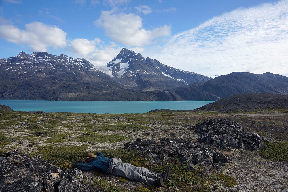 | Aus Sicherheitsgründen paddeln wir soweit möglich immer nahe dem Ufer. Die am nächsten Tag erforderliche erste Fjordüberquerung zwingt uns zu einer mehrstündigen Pause, weil Wind und Wellen zu stark sind. Wir warten genau an einem Handlungsort des berühmten historischen Romans „Evighedsfjorden“ von Kim Leine, wo sich gemäß fiktiver Handlung eine grönländische Kommune um einen abtrünnigen Propheten namens Habakuk angesiedelt hat. Dieser Ort heißt folglich „Habakuks Boplads“ [Boplads: dänisch für Siedlung] und ist gut gewählt, denn die Stelle zeichnet sich nicht nur durch einen atemberaubenden Rundum-Blick auf Seitenfjorde, Gletscher und pittoreske Gipfel aus. Wir finden hier auch alte Inuit-Gräber, Überreste primitiver Torfbauten und Unmengen verstreuter Knochen, die Zeugen einer alten Jäger-Kultur sind. |