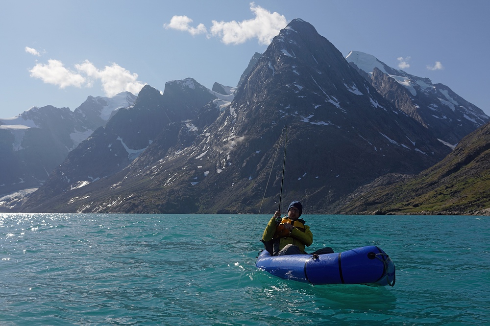 | Schließlich erreichen wir nach einer Woche das hinterste Ende des Fjords. Hier lassen wir die Luft aus den Booten und schnüren die Rucksäcke, denn weiter geht’s auf Schusters Rappen. Wir lassen die übrigen Pilker zurück – sie sind schwer und auf der nachfolgenden Etappe über Gletscher und Berge zählt jedes Gramm. Die Fliegenbox kommt hingegen mit – darum wird’s im zweiten Teil auch mit der Fliege gefangene Fische zu sehen geben. | ![]() |