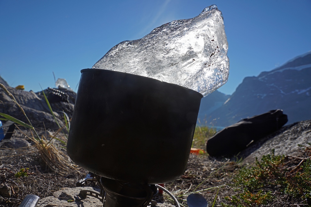 | Erst am Abend legt sich der Wind etwas, sodass wir uns auf die große Wasserfläche wagen. 4 km offenes, eiskaltes Wasser ohne Plan B für den Fall einer Kenterung oder eines Lecks in so einem Mini-Schlauchboot zu überqueren erfordert einiges an Überwindung. Umso größer ist die Freude, das Südufer zu erreichen, ums Kap zu fahren und eine noch grandiosere Landschaft vorzufinden. An den folgenden Tagen wird der Fjord immer enger und steiler, sodass viele Kilometer ohne irgendwelche Möglichkeiten für Rast- und Lagerplätze zurück zu legen sind. Wir finden nach längerem Suchen nur wenige Quadratmeter ebene Flächen, die gerade für ein Zelt ausreichen. Ist kein Süßwasser vorhanden, so schleppe ich mit dem Boot kleine Eisberge ans Ufer, von denen Brocken abgebrochen und mit dem Kocher geschmolzen werden. |