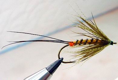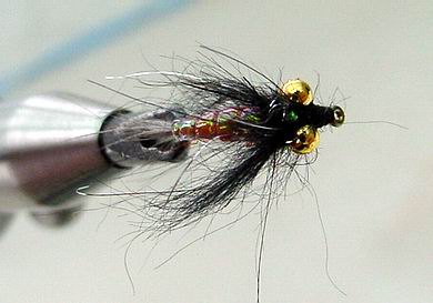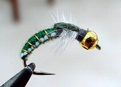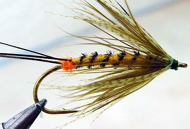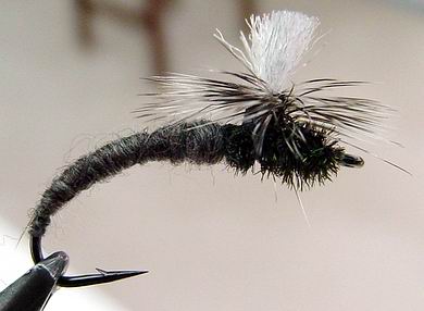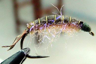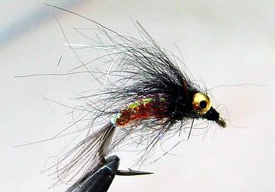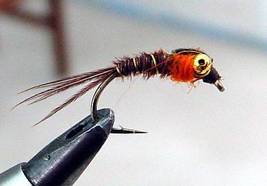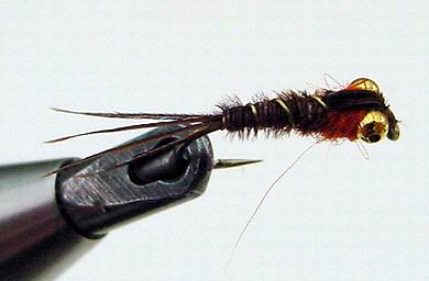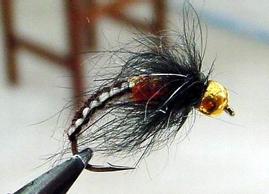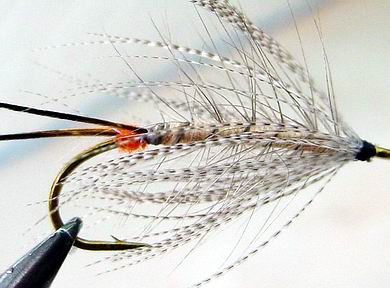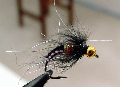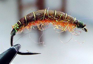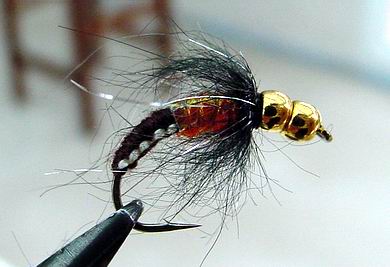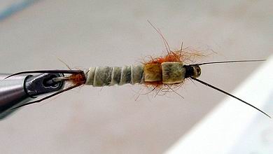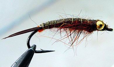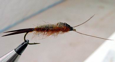 | Glitterback Sedge, brown / mit Hechel aus Dubbing... | und mit geknüpftem Körper sowie einer Kopfperle... |