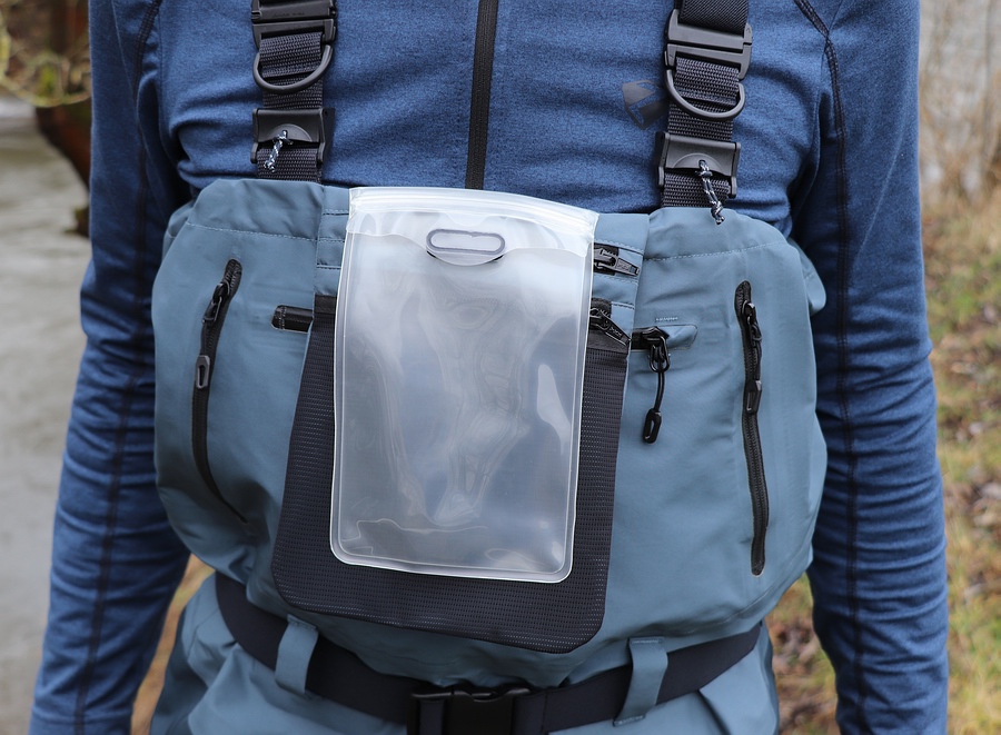 An der Innenseite des Brustbereiches befindet sich eine große, fix mit der Wathose verbundene, herausklappbare RV-Innentasche mit 2 aufeinander liegenden Reißverschlussfächern, mit Klettpatch und Schlüsselkarabiner zur Aufnahme von weiterem Zubehör. Das obere Fach wird von einem Meshgewebe gebildet. Jedes Fach lässt sich durch einen eigenen YKK-Reißverschluss verschließen. Eines der Fächer ist zudem mit einem Karabiner-Band ausgestattet, hier können z.B. die Autoschlüssel oder anderes wichtiges Zubehör sicher aufbewahrt werden. Am aufgesetzten Klettpatch lässt sich weiteres Zubehör anbringen, es dient aber auch für das Ankletten eines Flypatch zum Trocknen von Fliegen. Auch wenn die Wathose nur hüfthoch getragen wird, bleibt diese Funktion erhalten. So bleibt diverses Zubehör wie Vorfächer usw. jederzeit griffbereit. Zusätzlich befindet sich dort eine weitere transparente Innentasche. Diese zweite Brusttasche auf der Innenseite ist wasserdicht ausgeführt, sie besteht aus transparentem Kunststoff und ist ideal zum sicheren Verstauen z.B. eines Smartphones. Baden gegangene Handys gehören von nun an der Vergangenheit an und dank der Touch-Technologie kann das Smartphone durch die Hülle bedient und auch telefoniert werden, ohne es herausnehmen zu müssen. Die Smartphone-Tasche ist mit Klettverschluss an der Innenseite befestigt und lässt sich abkletten und ganz heraus nehmen. Auch an 2 D-Ringe für weiters Zubehör vorne Außen und an den Kescher-D-Ring auf den Rücken wurde gedacht. Im Test trug sich die Alpine Diver V3 gewohnt komfortabel, auch ihre Farbgebung gefällt uns gut. Die Größe des Testmodells (L) bot unseren Testfischern mit um 1,80 Meter Körperhöhe, um 85 Kilogramm Gewicht und bis Schuhgröße 45/46 eine sehr gute Passform, hohe Bewegungsfreundlichkeit und sehr guten Laufkomfort. Die Beinlänge bietet bei dieser Größe gute Reserven, was ein in die Hocke gehen oder Hinknien jederzeit und ohne lästige "Spannungen" ermöglicht. |