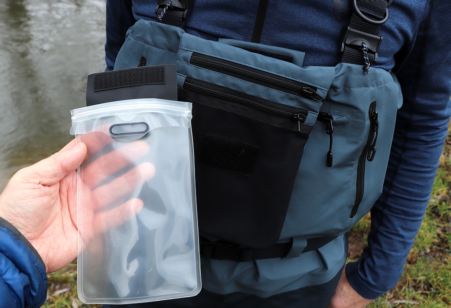 die große, tief geschnitteme und wassergeschützte RV-Brusttasche,