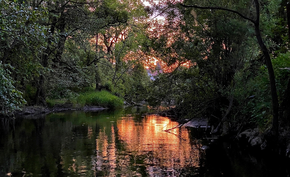 lauer Sommerabend am Fluss, im letzten Licht der untergehenden Sonne