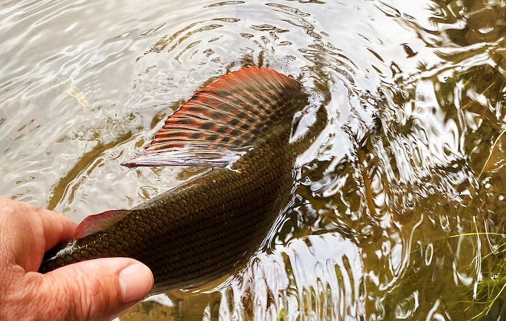 Es sind einige schöne Bachforellen im Fluss. Diese hier hat einen "Reiherstich" auf dem Kopf :-( |