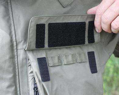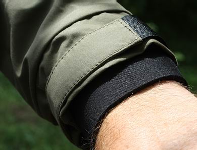 | Die Ärmel der Amphibian Wading sind lang und bewegungsfreundlich, vorne am Handgelenk kann man sie durch Neopren-Bündchen in Verbindung mit Klettband-Einstellern wirklich komplett wasserdicht abschließen - das ist hier toll gelöst! Zur zusätzlichen Belüftung an warmen Tagen befinden sich in den Achseln beidseitig Öffnungen mit hinterlegtem Mesh-Gewebe und Reißverschlüssen. Die Amphibian Watjacke weist eine ganze Reihe von großen Taschen auf: Vorne rechts gibt es eine "Multi"-Brusttasche (27 x 17 cm), deren Hauptfach (18 x 17 cm) mit einer doppelt Klettband-hinterlegten Klappe verschlossen wird. Darunter liegt eine weitere Tasche (21 x 17 cm), erreichbar über einen seitlichen, wasserdicht laminierten Reißverschluss. Die dritte Lage darunter bildet eine Fleece-gefütterte Handwärmertasche. Vorne gegenüber, also auf der linken Brust gibt es eine weitere "Multi"-Tasche (ebenfalls 27 x 17 cm). Das obere Hauptfach fehlt hier, dafür sind unter der doppelt Klettband-hinterlegten Klappe drei Schlaufen und ein Klett-Pad zum Anhängen von Utensilien zu erreichen. Außen auf der Klappe sitzt ein weiteres Klett-Pad zur Befestigung eines Fly patch (1 x Schaffell mitgeliefert). Darunter liegt wie schon auf der anderen Seite eine weitere Tasche (27 x 17 cm), erreichbar über einen seitlichen, wasserdicht laminierten Reißverschluss. Die dritte Lage darunter bildet ebenfalls wie schon gegenüber eine Fleece-gefütterte Handwärmertasche. Damit wären wir mit den Taschen aber noch nicht am Ende, denn es gibt zwei weitere Innentaschen (a. 27 x 15 cm) mit Reißverschlüssen und nicht zuletzt die riesige Rückentasche mit den Maßen 41 x 38 cm und mit Reißverschluss & Abdeckklappe zu verschließen. Wo wir gerade auf dem Rücken sind: Ganz clever gelöst wurde hier die Möglichkeit zur Kescherbefestigung: das Kescherband kann unter der Rückentasche hindurch nach oben zum D-Ring geführt und befestigt werden. Der Kescher befindet sich nun beim Transport unter der Rückentasche und kann nicht "verfängnisvoll" herumschlenkern! | ![]() |