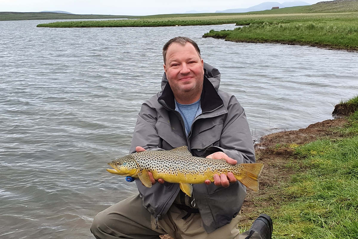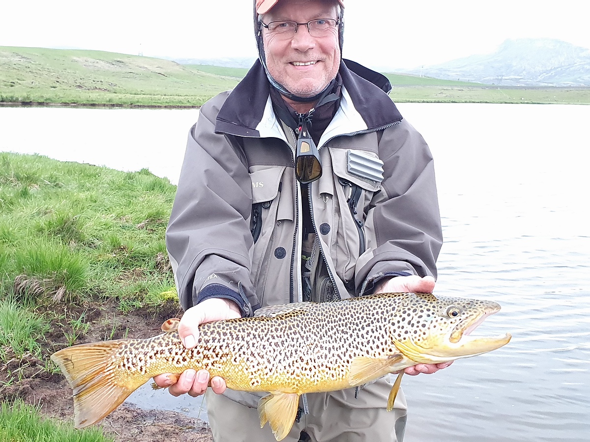Wir folgten dem Jeep unseres Guides Birkir und fuhren ein paar Kilometer zu unserem Beat ganz im Südosten des Thingvallavatn. Den letzten halben Kilometer auf einem ziemlich üblen Feldweg, auf dem es uns ganz schön durchschüttelte. Ich begann mit der 6er Hardy Zephrus, der neuen Hardy HBX 7/8 mit fast 200 Metern Backing (man weiß ja nie…) und einer 6er Schwimmschnur von Loomis. Ans 18er Fluocarbonvorfach (Stroft FC 1) kam eine beschwerte Nymphe in Größe 12 oder 14, sowie ein Bissanzeiger. Unser Guide riet uns, mit einer zweiten Nymphe am Seitenvorfach zu fischen. Wir blieben aber erstmal bei nur einer Nymphe. Wir begannen in einer flachen Bucht im Abstand von ca. 50 Metern, wateten einige Meter in den See hinaus und holten die Montagen – auf Rat unseres Guides - nach dem Wurf mit langsamen, gleichmäßigen Zügen ein. Wie meistens am Vormittag, war der Wind noch relativ moderat. Anfangs tat sich bei mir leider gar nichts, wobei mir die Stelle auch nicht besonders attraktiv erschien. Manfred konnte schon kurz nach dem Start einen gespotteten Fisch anwerfen, der aber nicht wollte. Nach ca. einer Stunde fing er den ersten Fisch unseres Island-Urlaubs, einen Arktischen Saibling mit ca. 35 cm. |