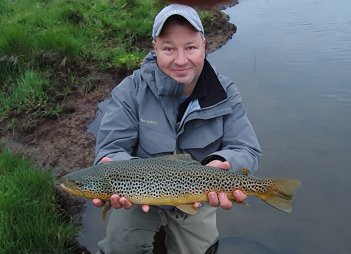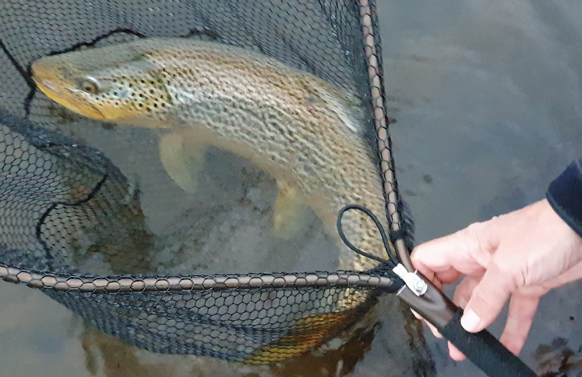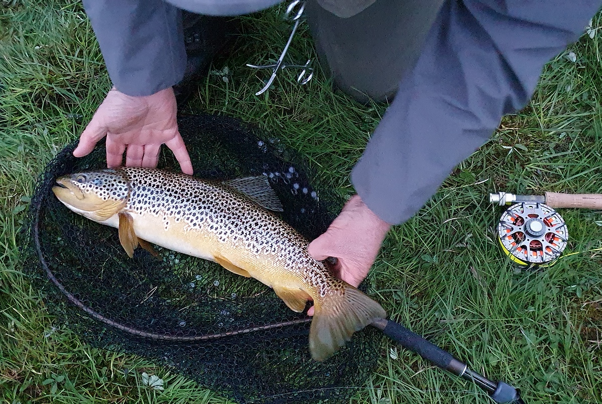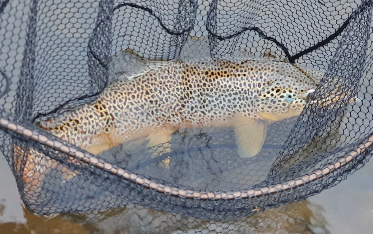 | Allerdings blieb die Fischerei vorerst weiterhin sehr zäh, bis ich gegen kurz nach halb neun endlich den ersten Biss des Tages auf meinen braunen Woolly Bugger mit Goldkopf hatte. Die Forelle biss hinter einer kleinen Schwelle in einem wunderschönen Gumpen, der in der Mitte des Flusses lag. Der Widerstand war recht heftig und deutete auf einen ordentlichen Fisch hin. An der 7er Rute und dem 28er Fluocarbonvorfach hatte die goldgefärbte Brown-Trout aber keine wirkliche Chance und lag nach kurzer Zeit in meinem Kescher. Die Kescherwaage zeigte 1,4 kg an und das Messen ergab 49 cm. Nach ein paar schnellen Fotos im Kescher setzte ich die Forelle schonend wieder zurück. Endlich schien der Knoten geplatzt zu sein! |