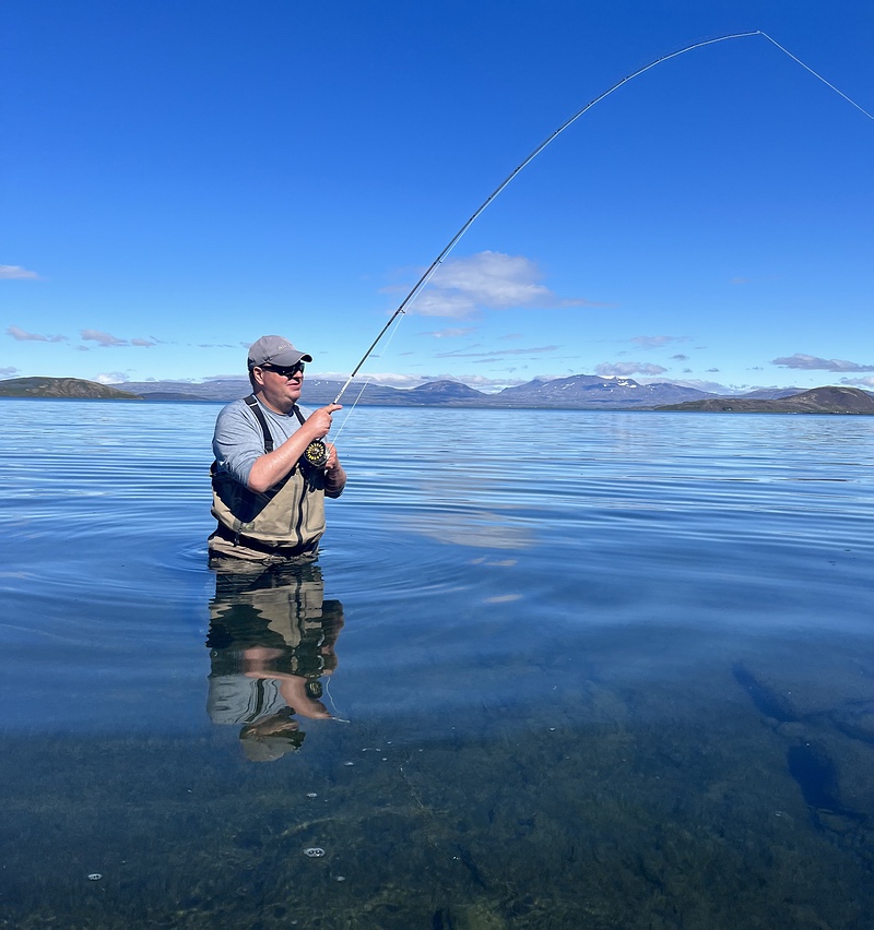 Kurz nach 18 Uhr starteten wir zum Villingavatn und hofften auf eine erfolgreiche Abendsession. Dort angekommen machten wir uns gleich wieder auf den Weg zur anderen Seeseite und stießen auf dem Weg auf den Guide, den wir zwei Tage vorher mit unserem Guide am Villingavatnsárós Beat 3 A getroffen hatten. Er war wieder mit „seinen“ drei Engländern unterwegs und erzählte uns stolz, dass sie einen guten Tag mit 8 oder 9 gefangenen Brown Trout mit bis zu 9 Pounds hatten und zeigte uns auch einige Bilder der Fische. Das war sehr beeindruckend und steigerte unsere Motivation nochmal zusätzlich. Kurz darauf trafen wir auf einen der drei Engländer und gratulierten ihm zu den Fängen. Allerdings meinte der nur, dass die Forellen – mit einer Ausnahme – vom Guide gefangen wurden und machte dabei eher einen bedröppelten Eindruck! Als wir die andere Seeseite erreicht hatten, trafen wir auf die beiden anderen Engländer. Einer von beiden erzählte uns dann noch, dass er gerade eben den ersten Biss des Tages hatte und eine Brown Trout mit 5 ½ Pounds gefangen hätte. Die anderen Fische hatte ihnen alle ihr „Guide“ weggefangen! Ohne Worte… Im Gegensatz zum heutigen Morgen blies der Wind leider schon wieder ziemlich heftig und das auch noch fast direkt von vorne. Ich begann deshalb auf einer kleinen Landzunge, wo der Wind zumindest leicht von der Seite kam. Da er dort aber von rechts kam, tat ich mich als Rechtshänder trotzdem ziemlich schwer. Ich stellte mich dann zwischenzeitlich sogar mit dem Rücken zum See und legte die Schnur beim Rückwurf ab, was überraschend gut funktionierte. Obwohl sich immer mal wieder einzelne Fische an der Oberfläche zeigten, hatten wir - trotz zunehmend verzweifelter Bemühungen - keinen einzigen Biss auf unsere Streamer. Manfred stellte deshalb relativ bald sein Trockenfliegengerät zusammen und warf immer mal wieder einen Fisch an, der in einigermaßener Nähe zum Ufer stieg. Ich versuchte es vorerst weiterhin mit dem oliven Dog Nobbler. Gegen 22 Uhr sah es so aus, als ob der Wind langsam etwas einschlafen würde. Ich wechselte deshalb auf meine 6er Sage XP und knotete einen gut gefetteten Stimulator in Größe 10 ans 22er Vorfach. Den konnte man wenigstens hin und wieder zwischen den Wellen erkennen! Leider tat uns der Wind nicht den Gefallen weiter nachzulassen. Im Gegenteil, er frischte sogar wieder etwas auf. Nachdem sich die Situation bis kurz nach |