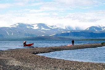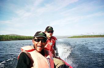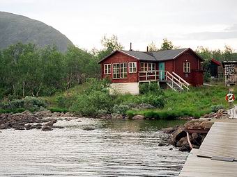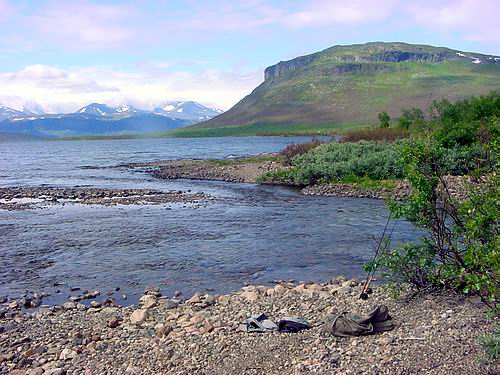 Das Camp besteht aus einer grossen zentralen Hütte und einigen kleinen Hütten für jeweils 4 Fischer. Es liegt direkt am Auslauf des Kaitumsee's: einem riesigen See umzingelt von Bergen, auf denen man noch Schnee legen sehen kann. Sogar eine Sauna direkt am See gibt es... |