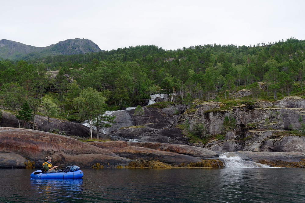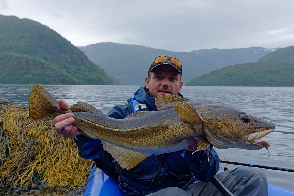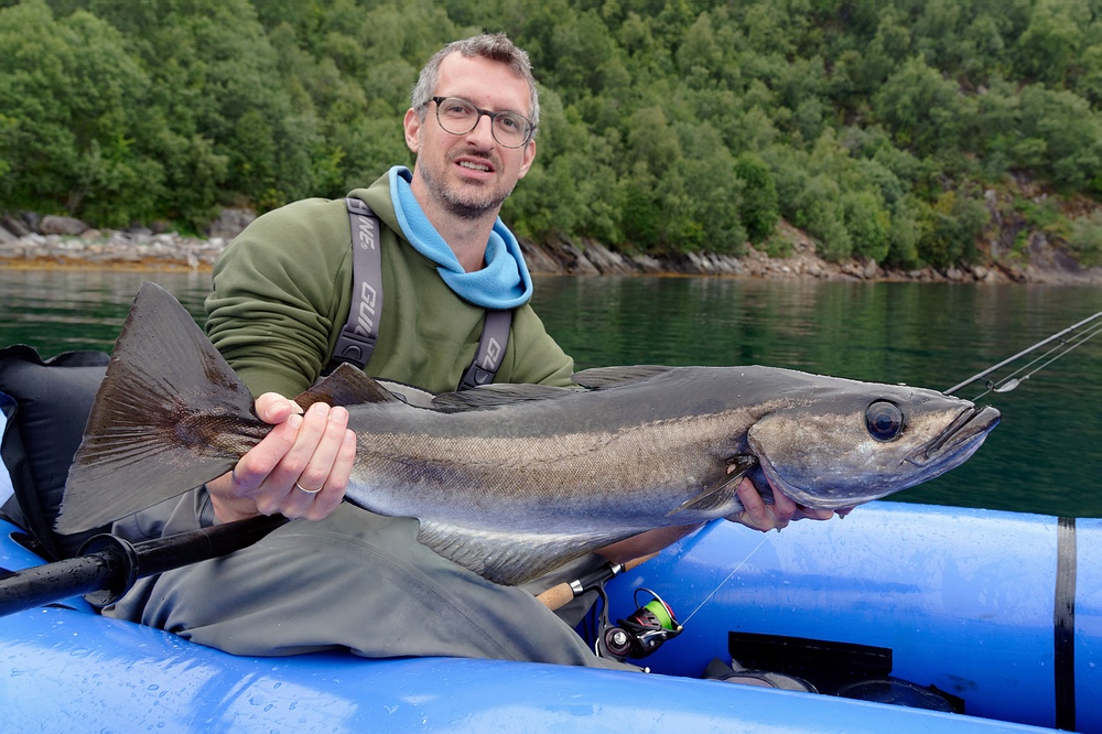 Jakob versucht es deshalb in Ufernähe vom Boot aus und fängt einen Pollack nach dem anderen, darunter ein großes Exemplar von mindestens 5 kg. Das war zwar die nicht die erhoffte Meerforelle, aber trotzdem ein beachtlicher Fang. Ich hingegen rücke mit einem Pilker aus und schon die ersten Durchgänge in einer Tiefe von rund 30 m bringen unmittelbar Fänge von Pollacks und kleineren Dorschen. Es bedeutet etwas Nervenkitzel, mit sich windenden, kernigen Fischen samt baumelnden Haken im dünnwandigen Schlauchboot zu hantieren. Unsere Packrafts haben nur eine Luftkammer, ein Loch wäre fatal. |