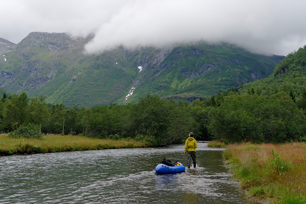 Packraft am Ufer entlang zu ziehen. Unfairer Weise flaut der Wind genau