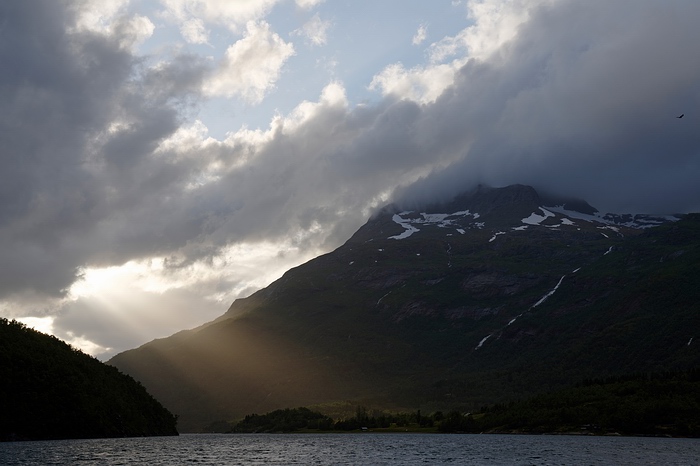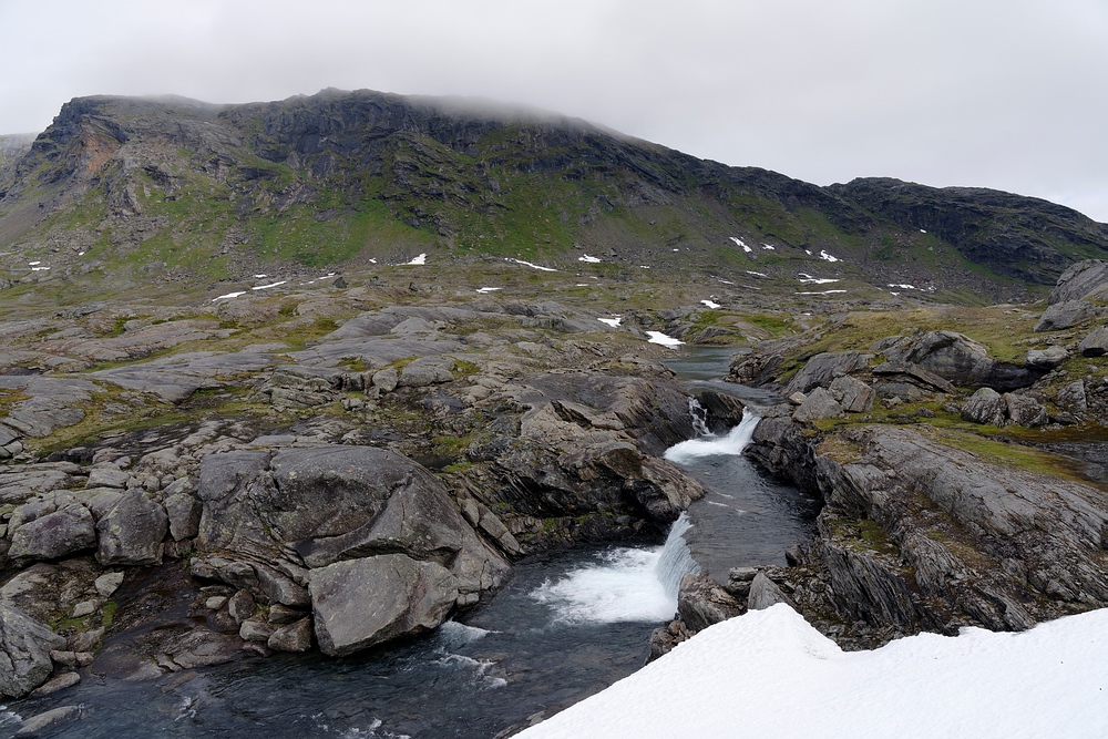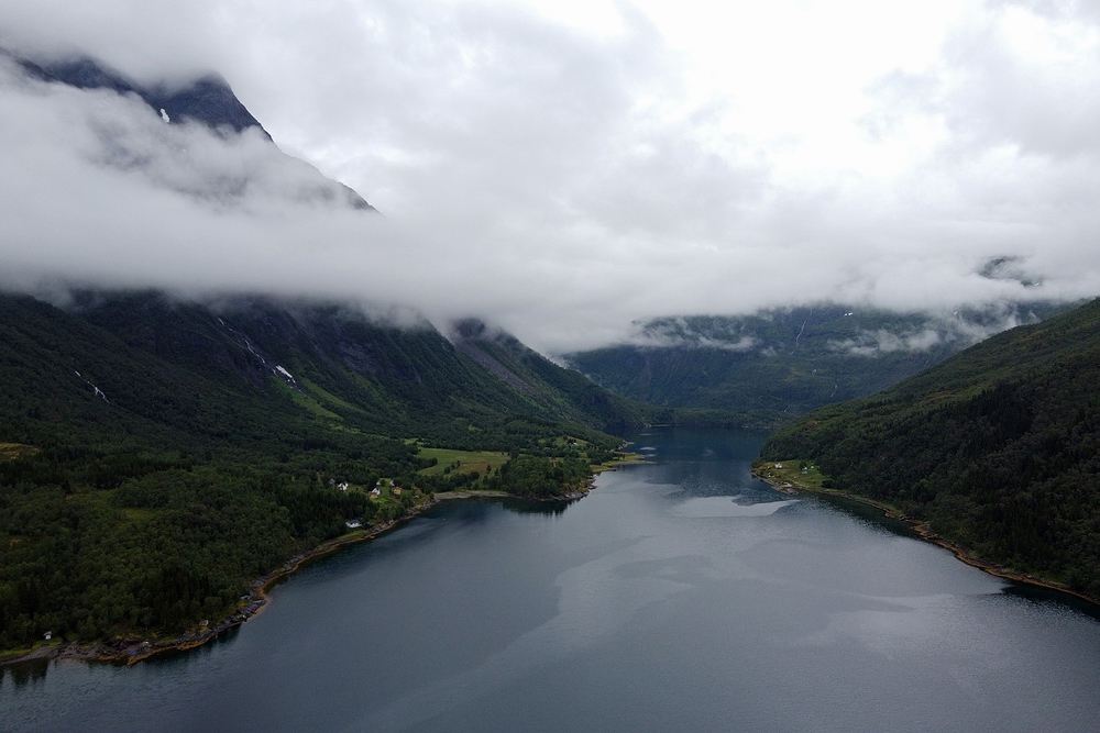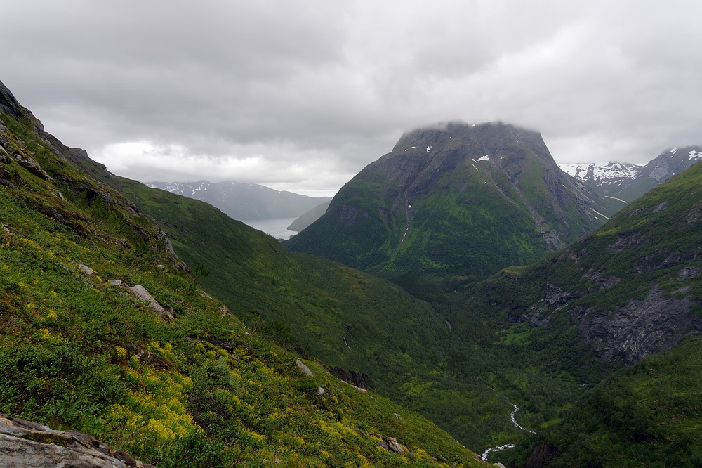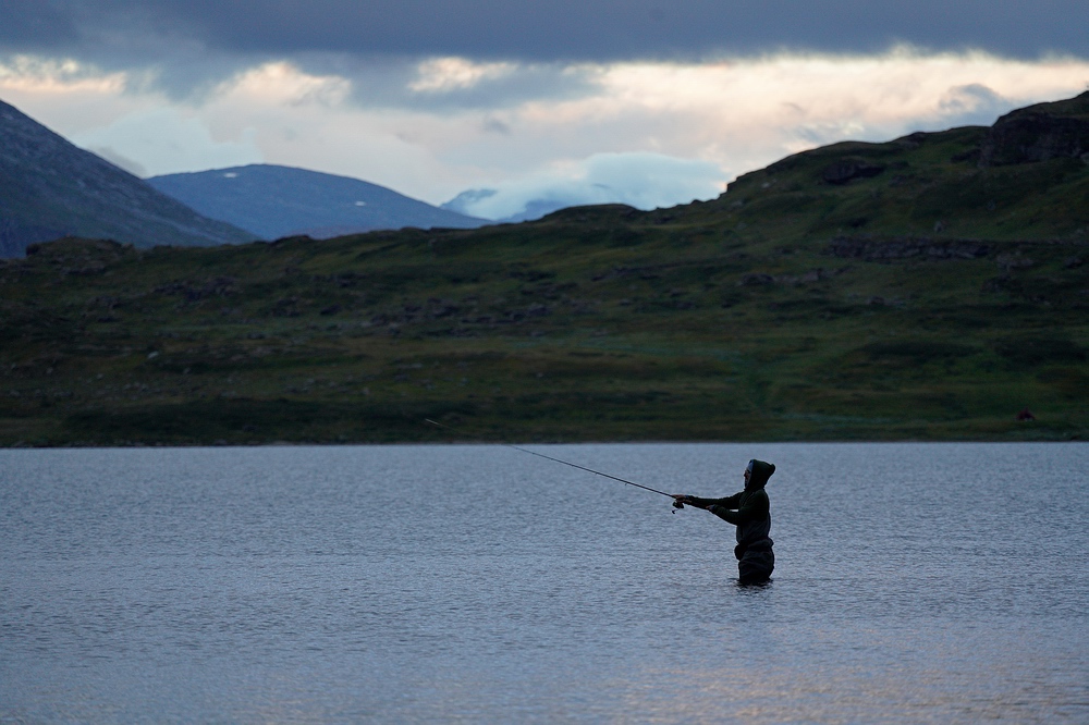 Richtiges Fischfieber kommt auf, als bei einer Bachmündung eine große Meerforelle nur einen Meter vom Ufer auf Jakobs Blinker beißt, aber nach kurzem Schütteln abkommt. Leider ist sie zu keiner weiteren Attacke zu provozieren, springt aber noch mehrfach in der Mündungsbucht. Am Abend des zweiten Tages trauen wir den Augen kaum, als ein weißes, meterlanges Fabelwesen die Oberfläche durchbricht. Es muss sich um einen Belugawal handeln, wir verfolgen das faszinierende Tier einige Minuten lang vom Ufer aus und genießen so gut es geht die mystische Stimmung im Fjord. Das Regenwetter des Vorabends setzt sich fort, die niedrigsten Wolken hängen nur wenige hundert Meter über uns an den steilen Flanken der Berghänge und sorgen in Kombination mit den steil herabstürzenden Bächen für eine atemberaubende Kulisse, die wir trotz der zunehmenden Durchnässung zu schätzen wissen. |