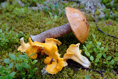 | Wir tragen unser Zeug am Fall vorbei den steilen Hang gleich bis zum nächsten See hinunter. Beim Einrinn finden wir einen wunderschönen Zeltplatz mit Kiesstrand und Feuerholz von krummen Weiden. Der Sonnenuntergang beschert ein goldenes Glühen des Gegenhangs und die Plackerei des Umtragens verleitet zu einem Sprung ins kühle Nass. Zu einem abschließenden Höhepunkt des wieder sehr erlebnisreichen Tages wird die köstliche Schwammerlsauce, die Jakob aus den gefundenen Rotkappen zaubert. |