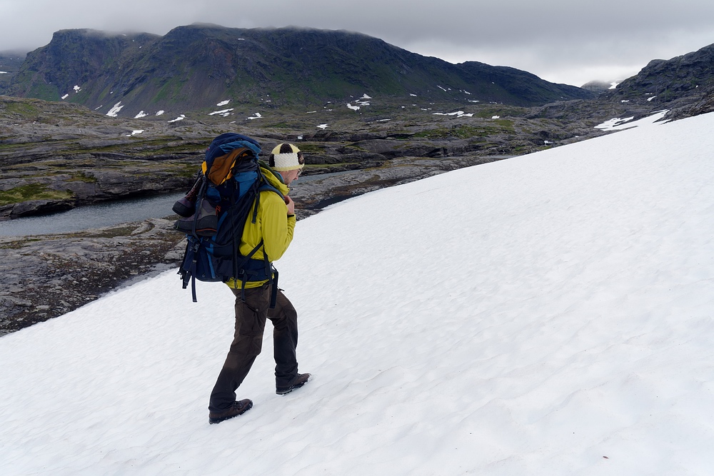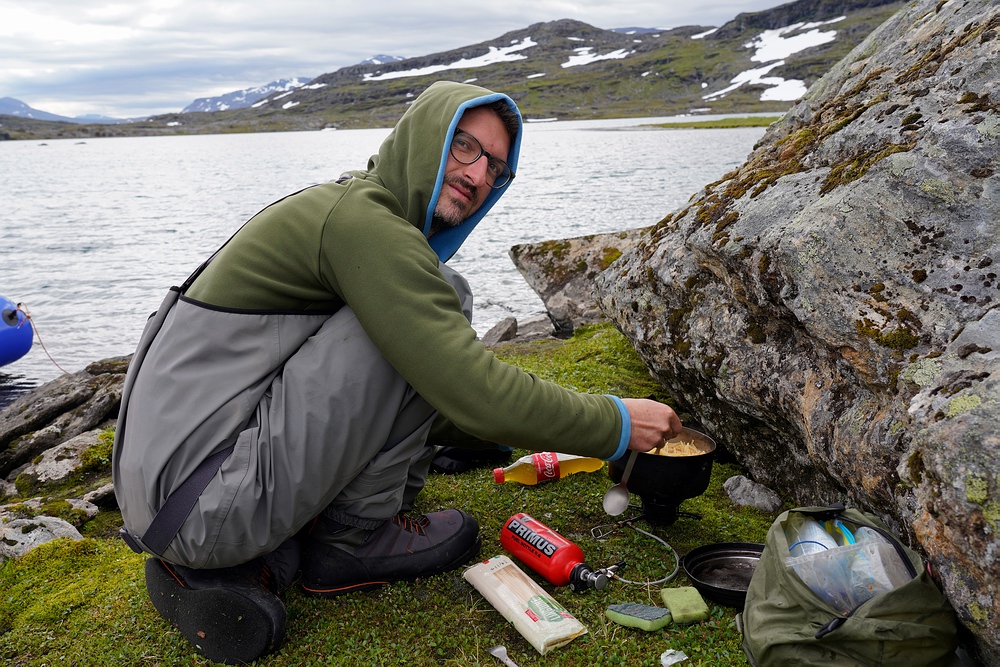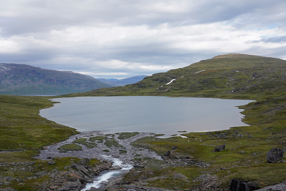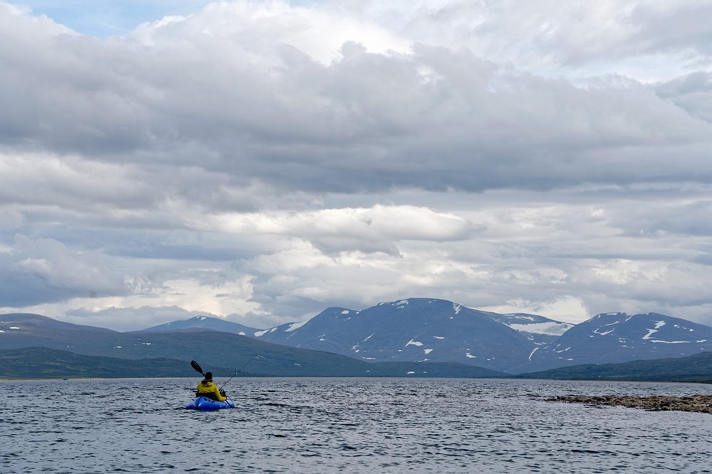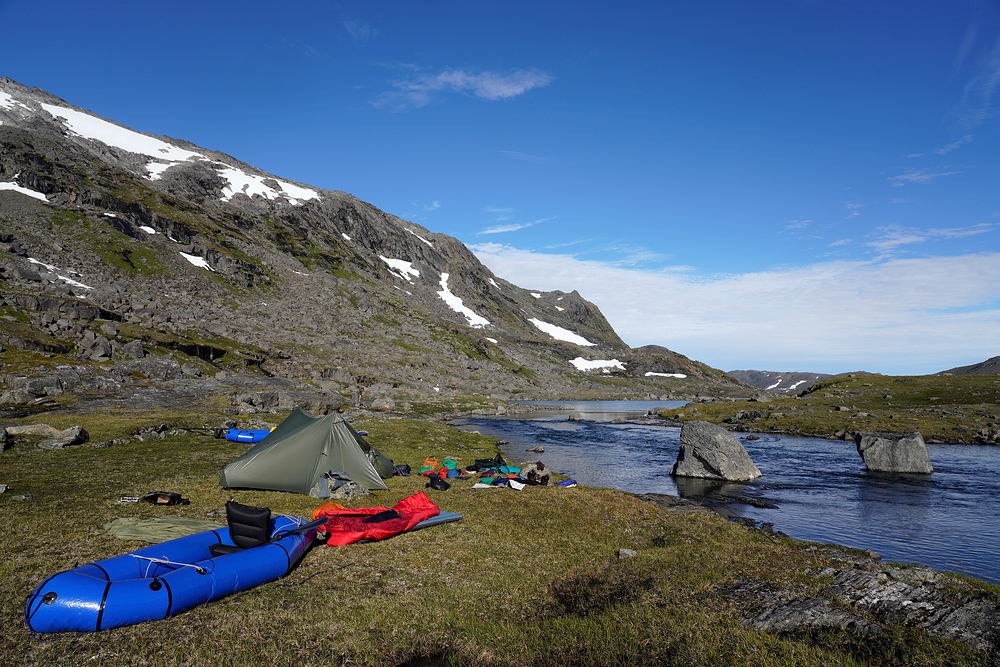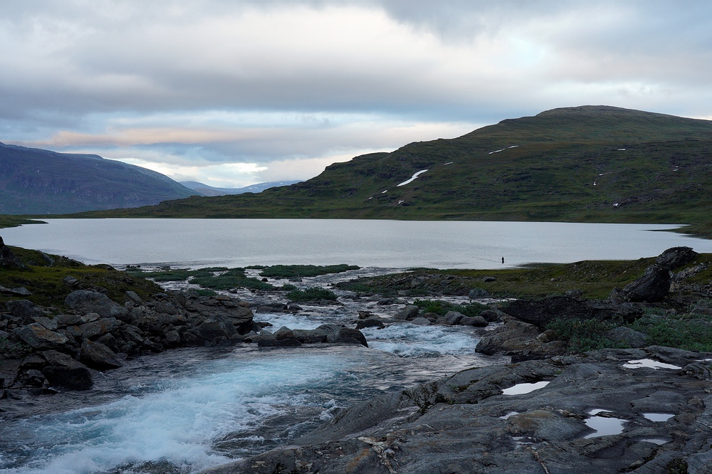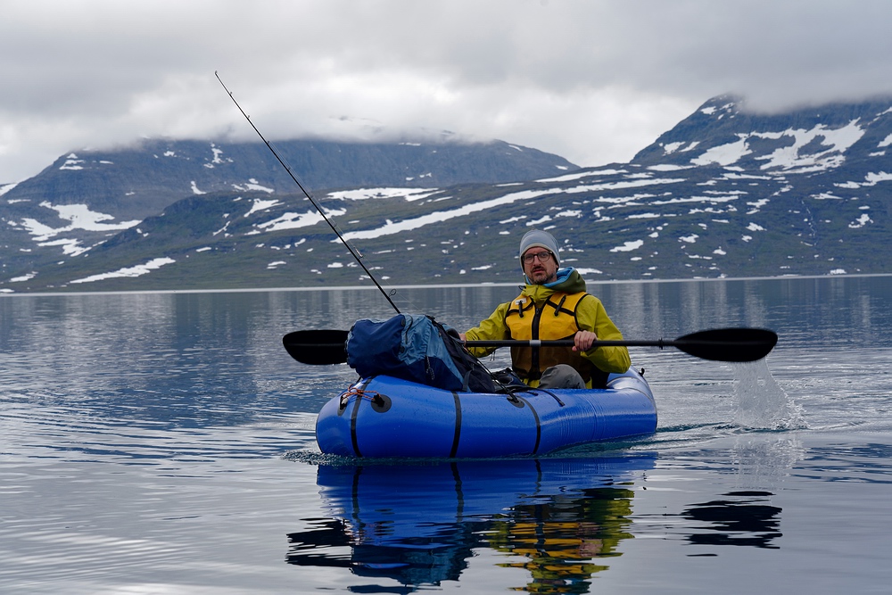 | Hier treffen wir das vorerst einzige Mal auf eine andere Menschenseele. Am anderen Ende des Sees steht ein Zelt und eine aus der Entfernung winzige Person, sodass ich zum Plaudern hin paddle. Der freundliche Schwede aus Gällivare ist per Motorboot auf dem großen Sitajsaure [Anm.: Jaure oder Javri heißt See in der Sprache der Sami] bis in die Nähe gefahren und hat seine Siebensachen zu diesem Bergsee hochgetragen, um hier ein paar Tage auf Saiblinge zu fischen. Bei vielleicht 6-7 °C Luft- und Wassertemperatur steht der Nordländer mit Sandalen im seichten Wasser und berichtet, dass der Sommer heuer ausgefallen ist. Versucht er, das mit sommerlichem Schuhwerk zu kompensieren? |
