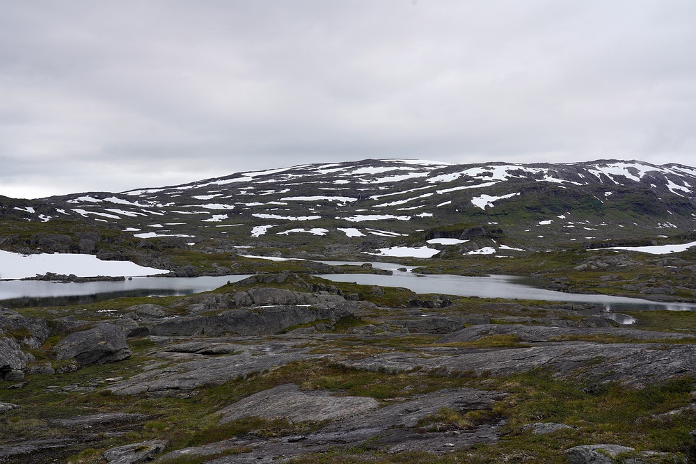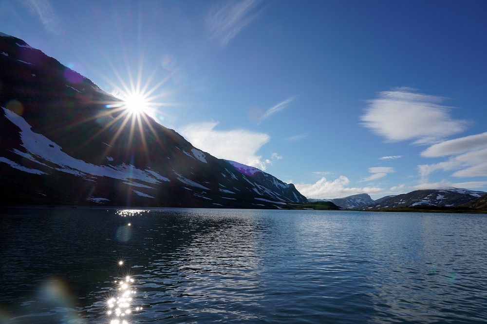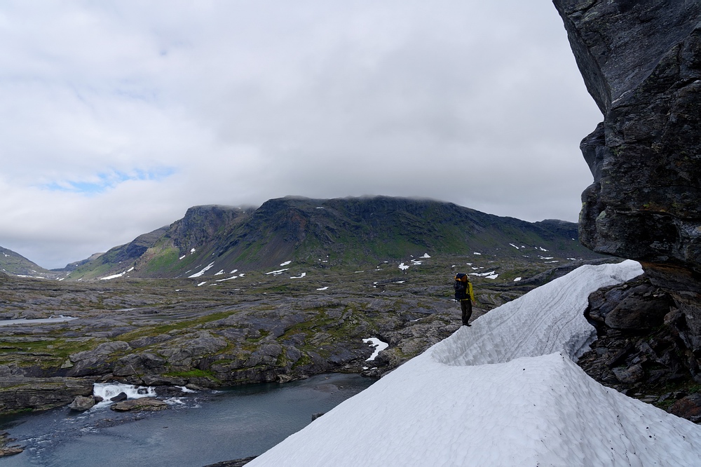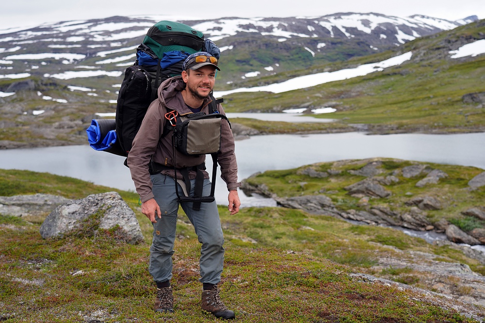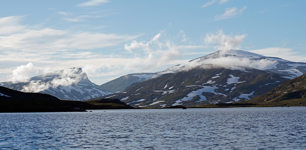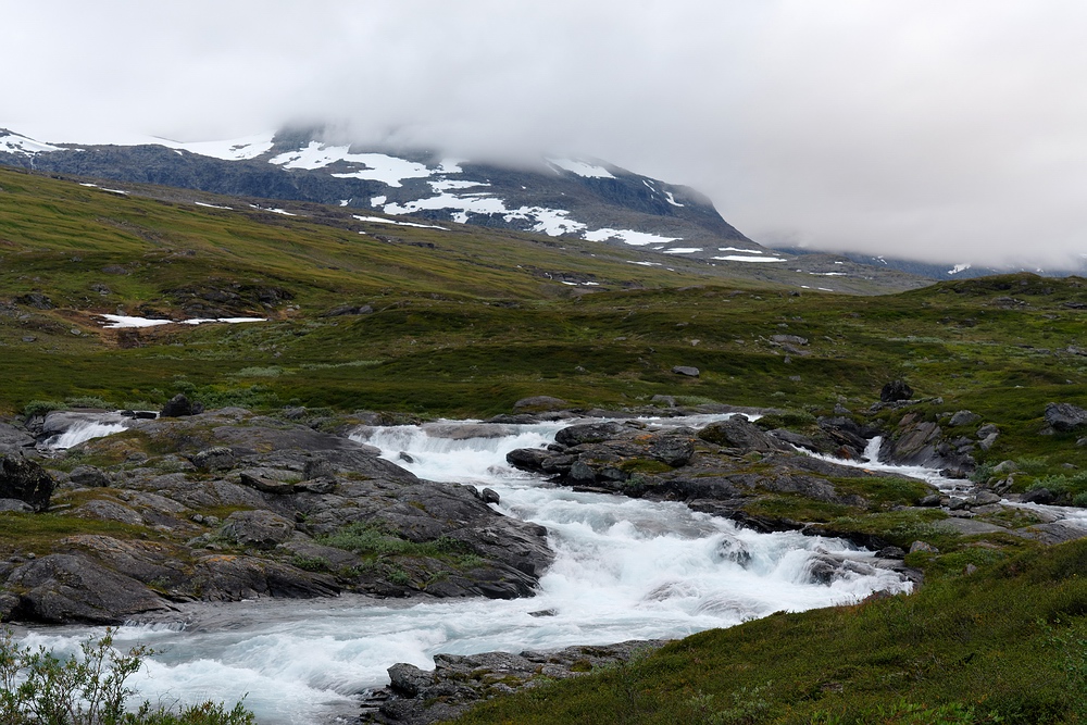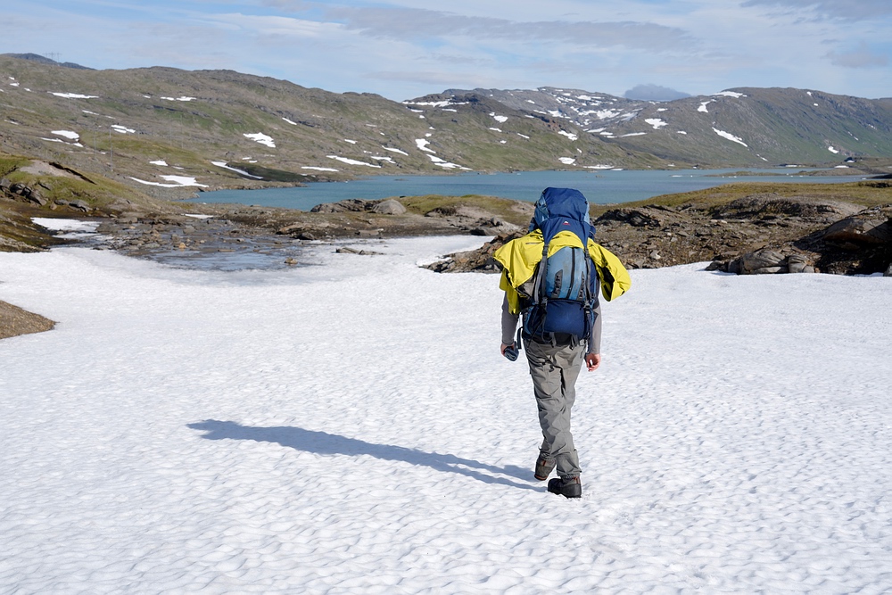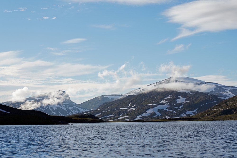 | Hier treffen wir das vorerst einzige Mal auf eine andere Menschenseele. Am anderen Ende des Sees steht ein Zelt und eine aus der Entfernung winzige Person, sodass ich zum Plaudern hin paddle. Der freundliche Schwede aus Gällivare ist per Motorboot auf dem großen Sitajsaure [Anm.: Jaure oder Javri heißt See in der Sprache der Sami] bis in die Nähe gefahren und hat seine Siebensachen zu diesem Bergsee hochgetragen, um hier ein paar Tage auf Saiblinge zu fischen. Bei vielleicht 6-7 °C Luft- und Wassertemperatur steht der Nordländer mit Sandalen im seichten Wasser und berichtet, dass der Sommer heuer ausgefallen ist. Versucht er, das mit sommerlichem Schuhwerk zu kompensieren? |