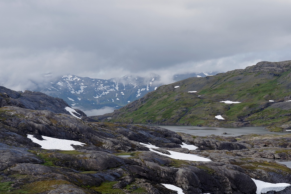 | In freudiger Erwartung, eine ganze Reihe größerer Seen zu erreichen, packen wir wieder unsere Rucksäcke und überqueren einen Bergrücken mit schöner Tundrenvegetation. Eingesprengte kleine Seen machen wiederholt Umwege notwendig. Unvergesslich bleibt der Moment, als wir den großen Kabtajaure erstmals erblicken – er rangiert unter den schönsten Plätzen die ich bisher gesehen habe. Herrlich eingerahmt zwischen Bergen mit einen dichten Mosaik an Altschneefeldern und Gletschern im Hintergrund liegt er vor uns. Sein Wasser leuchtet azurblau und ist dermaßen klar, dass man beim drüberfahren ein flaues Gefühl bekommt, ähnlich wie Höhenangst. Lässt man einen Stein in die Tiefe fallen, so sieht man diesen erst dann nicht mehr, wenn er zu klein geworden ist, nicht wie üblich wegen Dunkelheit oder Trübe. Mitten auf diesem großen See, der fast die doppelte Fläche des Mondsees aufweist, schwimmt ein Prachttaucher und stößt schaurige Rufe aus. Weil ansonsten Totenstille herrscht, nehmen wir die über Kilometer hallenden Töne als durchdringend laut war. Die Gegend hier oben wirkt ansonsten entwest, ob des schlechten Wetters sind die mit ihren Rufen die Tundra sonst so prägenden Vögel wohl schon in die Tiefländer abgezogen. |