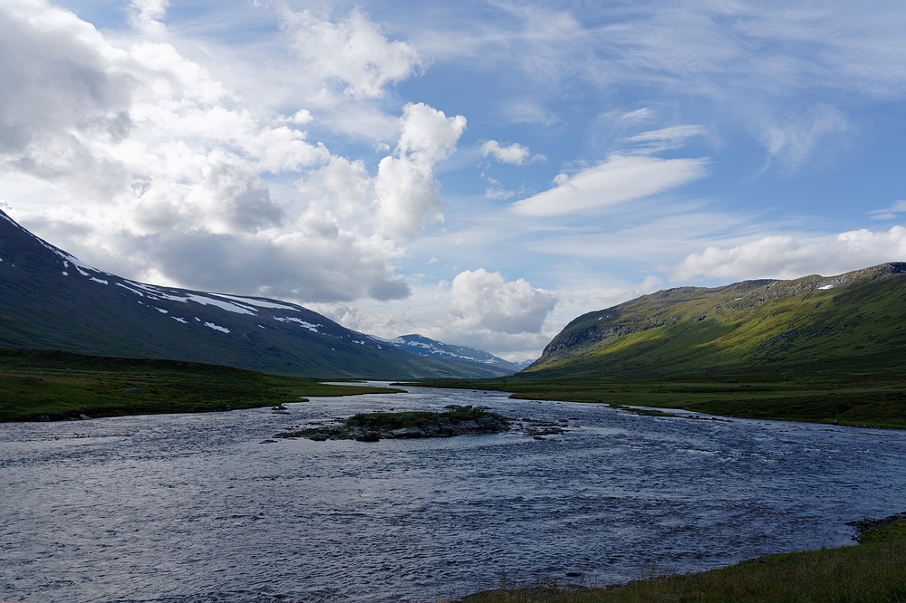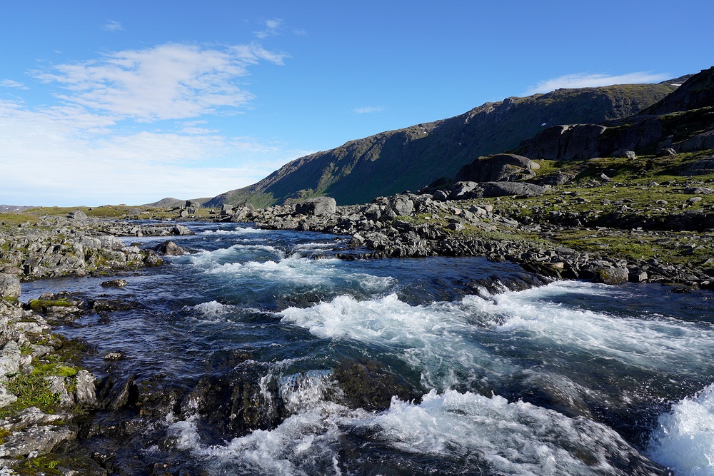 | Wie schon mehrfach erlebt, gibt es auf den steil eingefassten Seen hier nur zwei Extreme: entweder direkten Rücken- oder Gegenwind. Schon früh am Vormittag kommt die ungünstige Variante auf, sodass wir nur mit Mühe und kräftigem Paddeln den Ausrinn erreichen. Wieder folgt eine schöne Fließstrecke mit Wildwasser, und schon finden wir uns im riesigen Sitasjaure. |