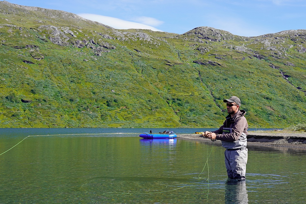 | Die nächste Etappe besteht aus einem hurtigen Wildbach, der teils befahrbar ist, teils aus wilden Katarakten und Wasserfällen besteht, die umtragen werden müssen. Anschließend folgt eine weitere Seenkette, die schon sehr fischverdächtig anmutet. Intensive Fischereiversuche während der Mittagspause mit Trockenfliege, Nymphe und „allem was Gott verboten hat“ bringen aber nur ein paar Miniatursaiblinge. Wir entschließen uns, weiter zu einem etwas größeren See unterhalb eines sehenswerten Wasserfalls abzusteigen, wo es gute Saiblinge geben könnte. In einer der letzten Stromschnellen reißt sich Jakob auf einer Länge von fast 30 cm den Bootsboden auf und kämpft sich mit dem vollgelaufenen Boot ans rechte Ufer. Die Klebeaktion gelingt und das Packraft ist zum Glück am Tag darauf wieder voll einsatzbereit. Auch fischereilich gibt es Positives zu berichten: Wo der Wildbach in den See mündet fange ich noch am Abend der Ankunft einen herrlich türkis schimmernden, 48 cm langen Saibling mit schnittigen Proportionen, und ein paar weitere um die 35-40 cm folgen. |