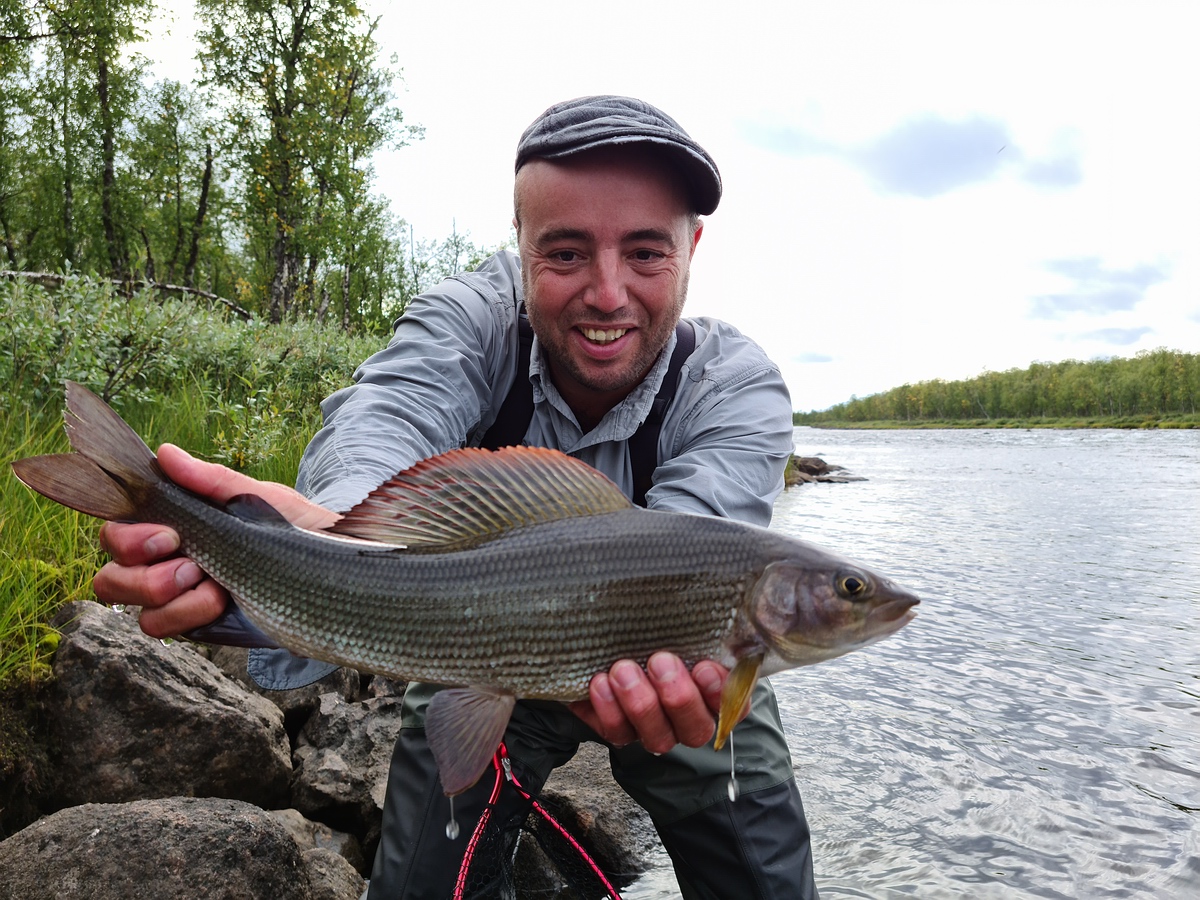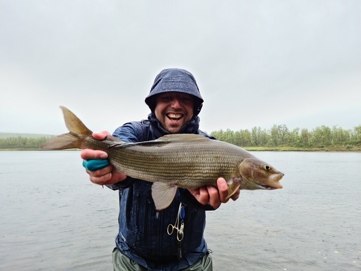 Wir fischten den Kanal, der zu dem Hauptstrom führte. Dort fanden wir einen großen Schwarm Barsche und jeder konnte ein paar fangen. Wir befischten danach den Einlauf des Baches, welchen wir am Vortag ausgelassen hatten. Durch den Regen und das zusätzliche Wasser wurde dort viel Sauerstoff und kälteres Wasser eingetragen. Nach ein paar Würfen war auch meine Hechtrute richtig krumm, aber schon nach der ersten Flucht verlor ich den Fisch, ohne ihn gesehen zu haben. Er fühlte sich echt groß an… Irgendwie lief es immer noch nicht bei mir, meine Ausbeute lag locker bei 1 zu 8. Wir gingen dann zum Hauptstrom und Sven fing noch 3 kleine Grashechte auf eine schwimmende Lemmingimitation aus Rehhaar. Der Wind nahm immer weiter zu und machte das Fischen mit der 7er fast unmöglich. Ich wollte unseren Weg abkürzen und durch das flache Becken zurück waten und keine 800m drumherum gehen. Doch wie es immer so ist, war eine ca. 1,5m tiefe Rinne genau vor dem anderen Ufer. Also umdrehen und die 200m wieder zurück durch Wasser waten. Nach einer gefühlten Ewigkeit und total fertig kamen wir am Zelt an. Ich hatte aber noch nicht genug und wollte mein Glück vor unserem Zelt probieren. Sven war zu fertig und hat sich im Regen vor unser Zelt gesetzt und mir zugeschaut. Mit Nymphe ging nicht viel, aber als ich dann eine Redtag swingen ließ, hatte ich 4 Fische am Band, aber wie es in diesem Urlaub so war, verlor ich im Drill alle 4. Ich wollte schon aufgeben, doch dann endlich blieb eine Äsche hängen und ich konnte nach langem Drill diese pralle 50er Äsche im Kescher landen (siehe Foto unten). |