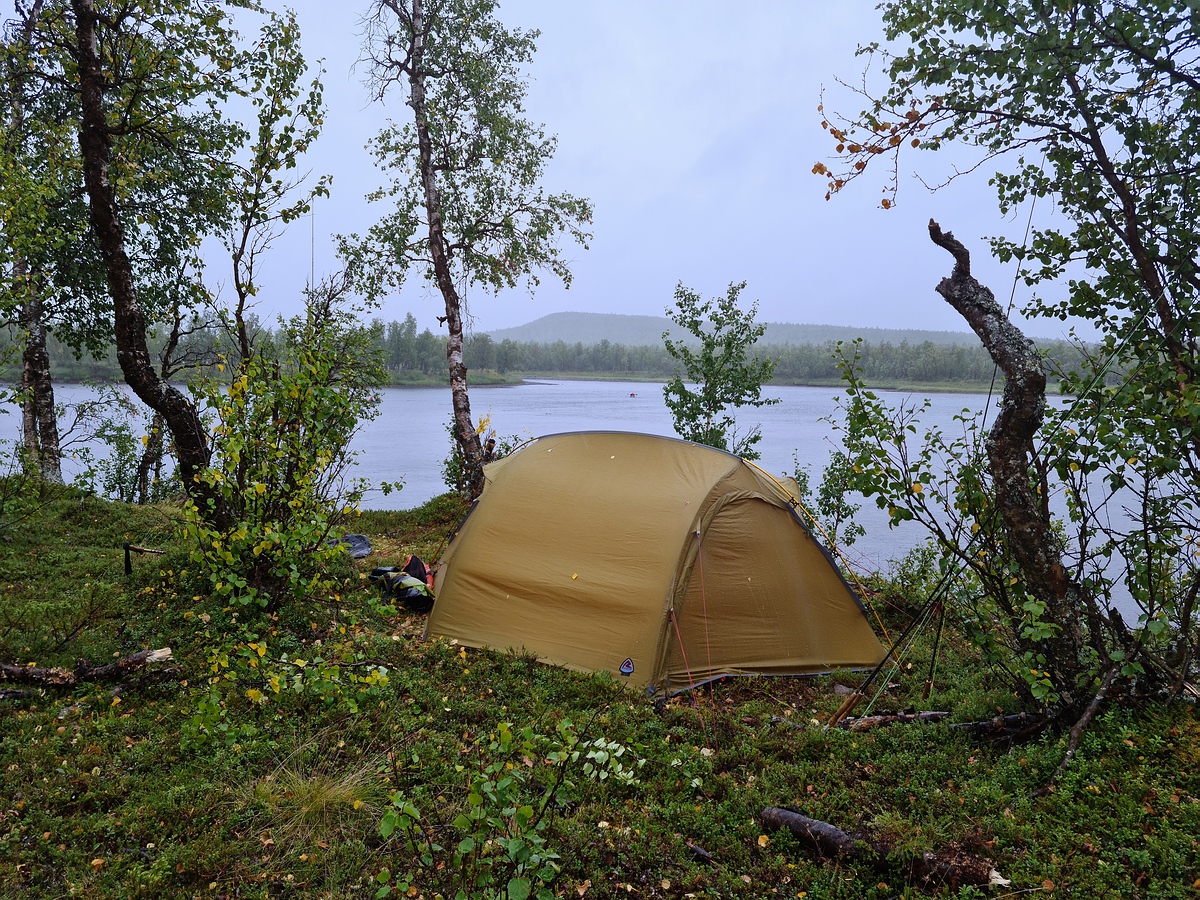 Schnell wurde das Zelt aufgebaut und die Angelsachen incl. Packraft gepackt.