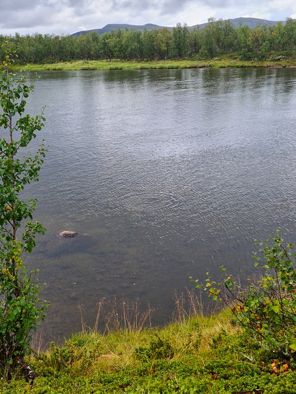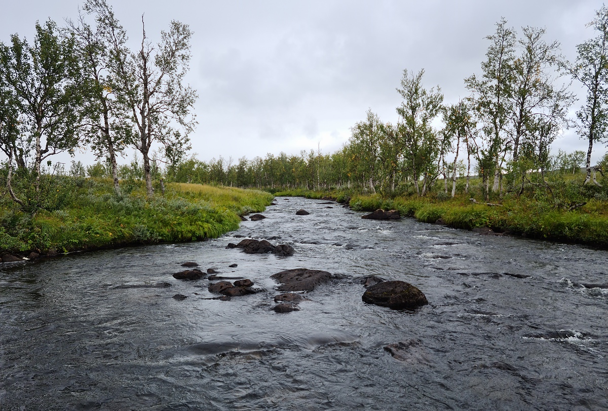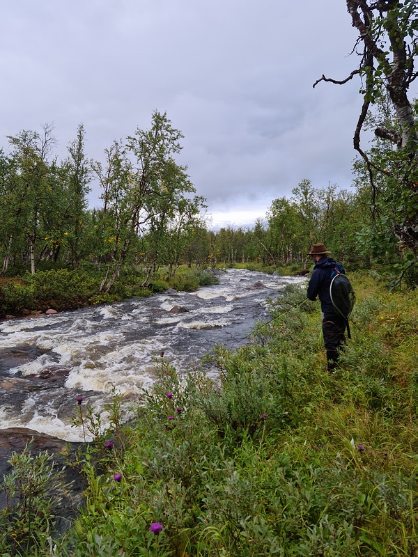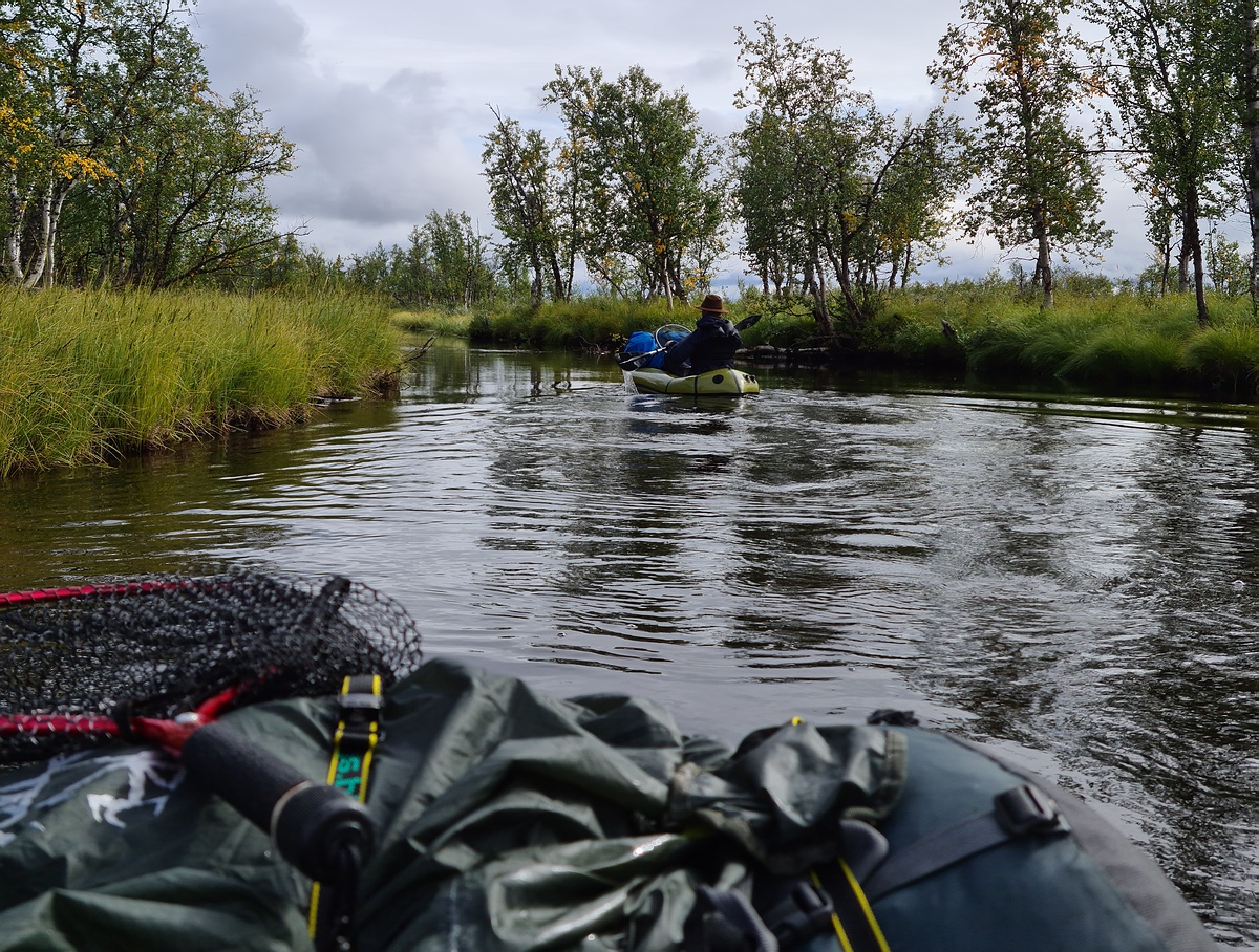Am Fluss mussten wir noch über einen Rentierzaun klettern und konnten dann das erste Mal unser Packraft aufbauen, um auf die andere Flussseite über zu setzen. Die Flussseite auf der wir wanderten, gehört den Sami und da durften wir mit unserer Angelkarte nicht Fischen. Drüben angekommen, fischten wir das Ende einer großen Rausche und hofften dort auf große Forellen und Äschen. |