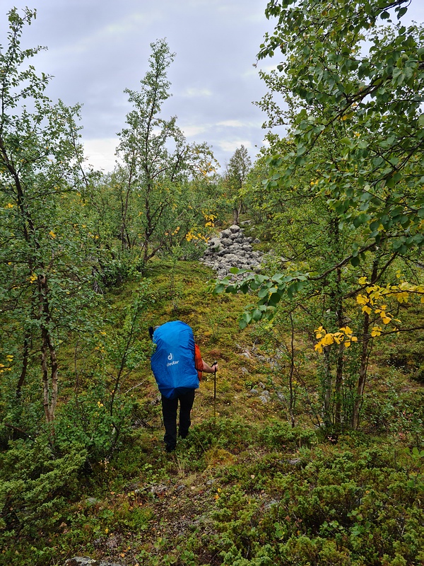 Wir werden mal wieder durch Regen geweckt, rein in die nassen Stiefel und weiter geht es. Wir erwischen zum Glück ein Zeitfenster von 1h wo es mal nicht regnet. Ziel ist jetzt ein großer See, den wir dann ca.5km mit dem Packraft entlang paddeln wollen. Der Weg geht erst durch eine beschwerliche Hügellandschaft und dann durch schwer begehbare Krüppelbirkenfelder und Sümpfe. Leider verlaufen wir uns etwas und gehen ca. 2km leicht in die falsche Richtung den Berg rauf. Svens Knie fängt an zu schmerzen und wir machen mehrere Pausen. Svens Laune hat einen neuen Tiefpunkt erreicht und er fängt an stinkig auf mich zu werden, da ich die Führung übernommen hatte und wir einen Umweg gelaufen sind. Wir sehen dann aber, dass hier das Gelände deutlich angenehmer war als auf unserem ursprünglichem Weg. Das war ein kleines Trostpflaster und konnte die Laune etwas heben. Als es nur noch Berg ab gehen sollte, kann Sven mit seinem Knie kaum noch laufen. Somit nehme ich ihm erstmal 2Kg Gepäck ab. Nach ca. 2km kommen wir an ein kleines Sumpfgebiet, welches wir auch direkt durchqueren müssen. Ich erkunde den Weg und finde nach mehreren Anläufen einen Weg. Sven folgt mir, geht aber, warum auch immer, 30m weiter von mir entfernt durch die tiefste Stelle. Ich rufe noch Stopp, doch Sven reagiert nicht mehr und versinkt bis zum Knie im Sumpf. Jetzt hat auch er beide Füße nass und Wasser in den Schuhen. Wie die Laune jetzt ist brauche ich wohl nicht beschreiben, ich denke das kann sich jeder denken. 300m vor dem See sackt Sven zusammen und sagt dass er nicht mehr weitergehen kann. Ich lasse ihn dort sitzen, um meinen Rucksack zum See zu bringen. Danach geht es zurück zu Sven und mit seinem Rucksack auf meinen Schultern und ihm im Schlepptau zurück zum See. Am See bauen wir unsere Packrafts auf. Ich will hier noch auf Hecht fischen, aber da Sven so erschöpft war, mussten wir erstmal einen Zeltplatz finden, damit er sich hinlegen konnte. Also paddelten wir über den See zum Auslauf. Ich war jetzt auch erstmal schlecht gelaunt, da die Stelle nach großen Hechten förmlich gerochen hat. Sven´s Gesundheit hatte aber natürlich Vorrang und die Zeltplatzsuche sollte sich noch als schwer genug herausstellen. Es gab nur Sumpf, Sumpf und Krüppelbirken. Bei der Überfahrt mit Rückenwind konnten wir dann noch einen Elch sehen, der aber dank des Windes in seine Richtung, nach dem Bild reißaus nahm. |