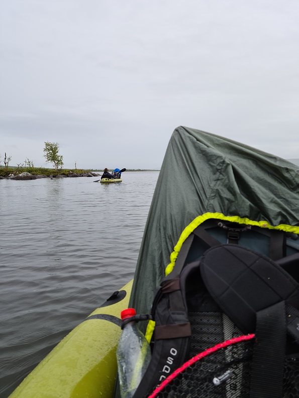 | Nachdem wir nun eine Weile gefischt hatten, mussten wir langsam mal weiter. Der Fluss sah sehr ruhig aus und da kein Wind wehte, sind wir dann mit dem Packraft flussaufwärts gepaddelt. Das ging erstaunlich gut und wir schafften ziemlich schnell unsere Tagesetappe. |