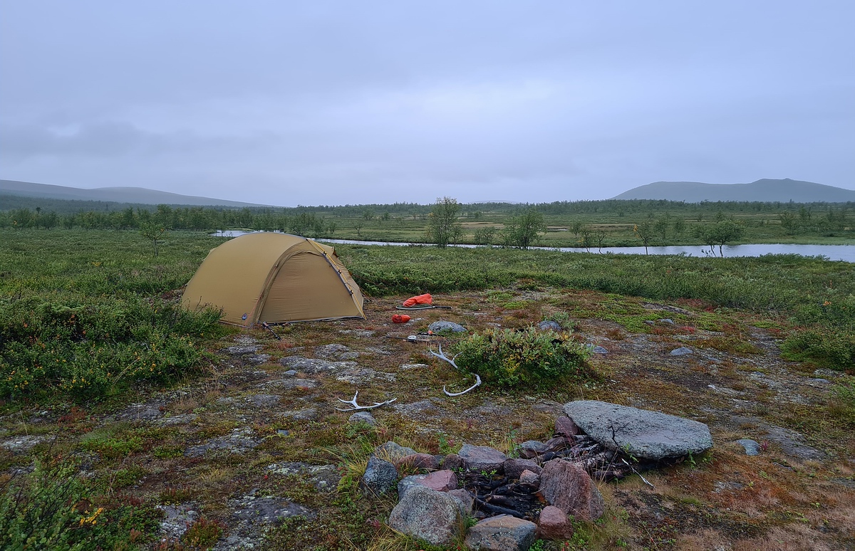 | Am Auslauf des Sees fanden wir dann nach einiger Zeit eine Erhöhung, die wohl in der Vergangenheit schon als Lagerplatz diente. Dort war eine Feuerstelle und 3 Plätze für Zelte. Wir verankerten die Packrafts und bauten schnell unser Zelt auf. |