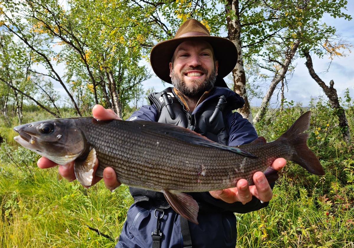 | Wir erreichten einen kleinen Gumpen und sahen dort mehrere Äschen am steigen. Also wurde kurzerhand die Tenkara aufgebaut und mit Nymphe gefischt. Jeder konnte 5 Äschen fangen und hat ebenso viele verloren. Svens größte hatte stolze 49cm. Zu unserem Erstaunen hatten mehrere Äschen ausgerissene Mäuler. Das machte uns nachdenklich, wir fanden unseren Zeltplatz sowieso merkwürdig. Es lagen Rentiergeweihe rum und alles sah so aus wie vor 4 Jahren, wo wir über viele Heli Camps gestolpert sind. Das würde auch die eher kleinen Hechte und die ausgeschlitzten Äschen erklären. |