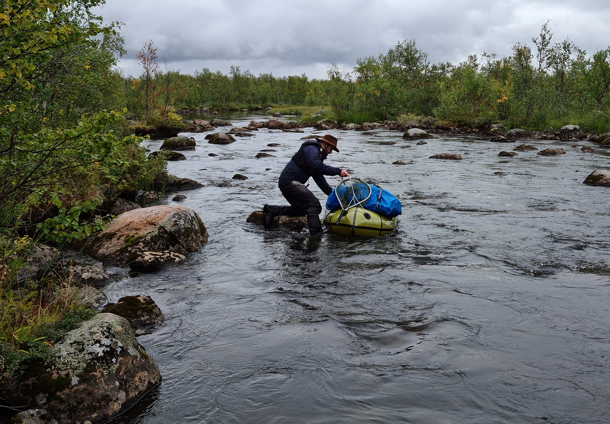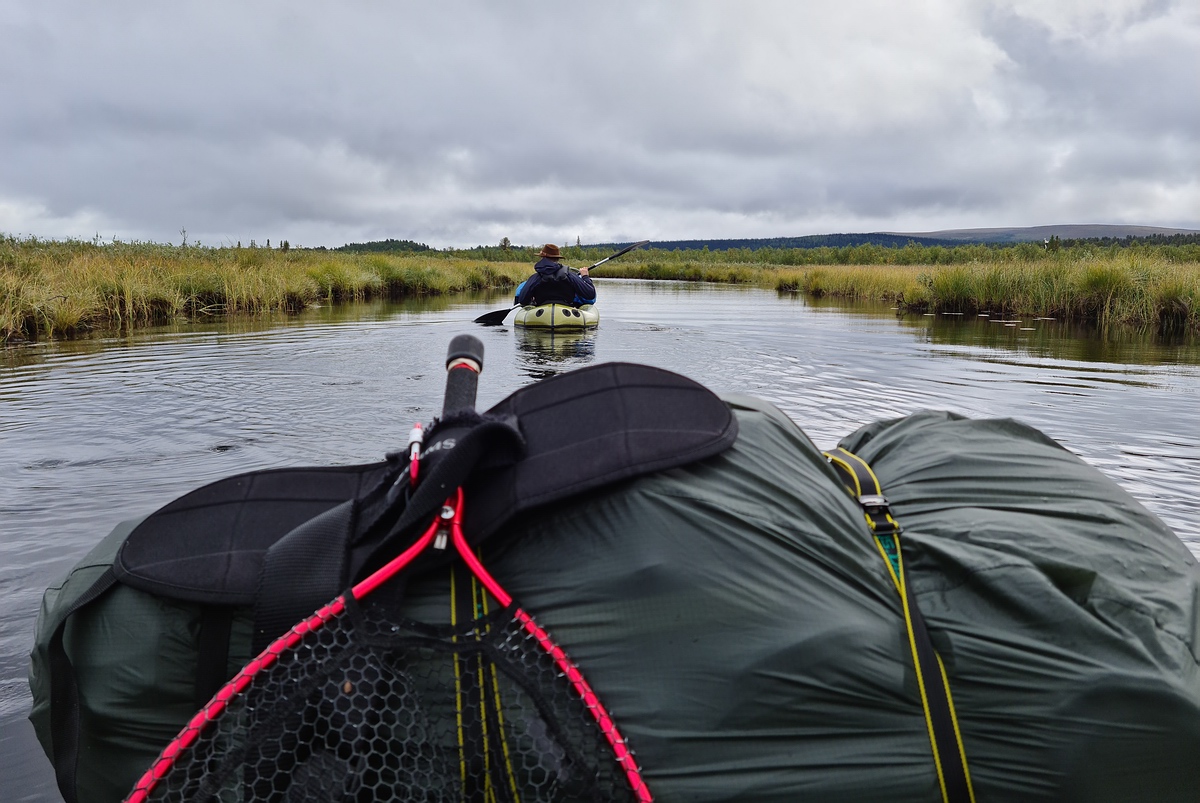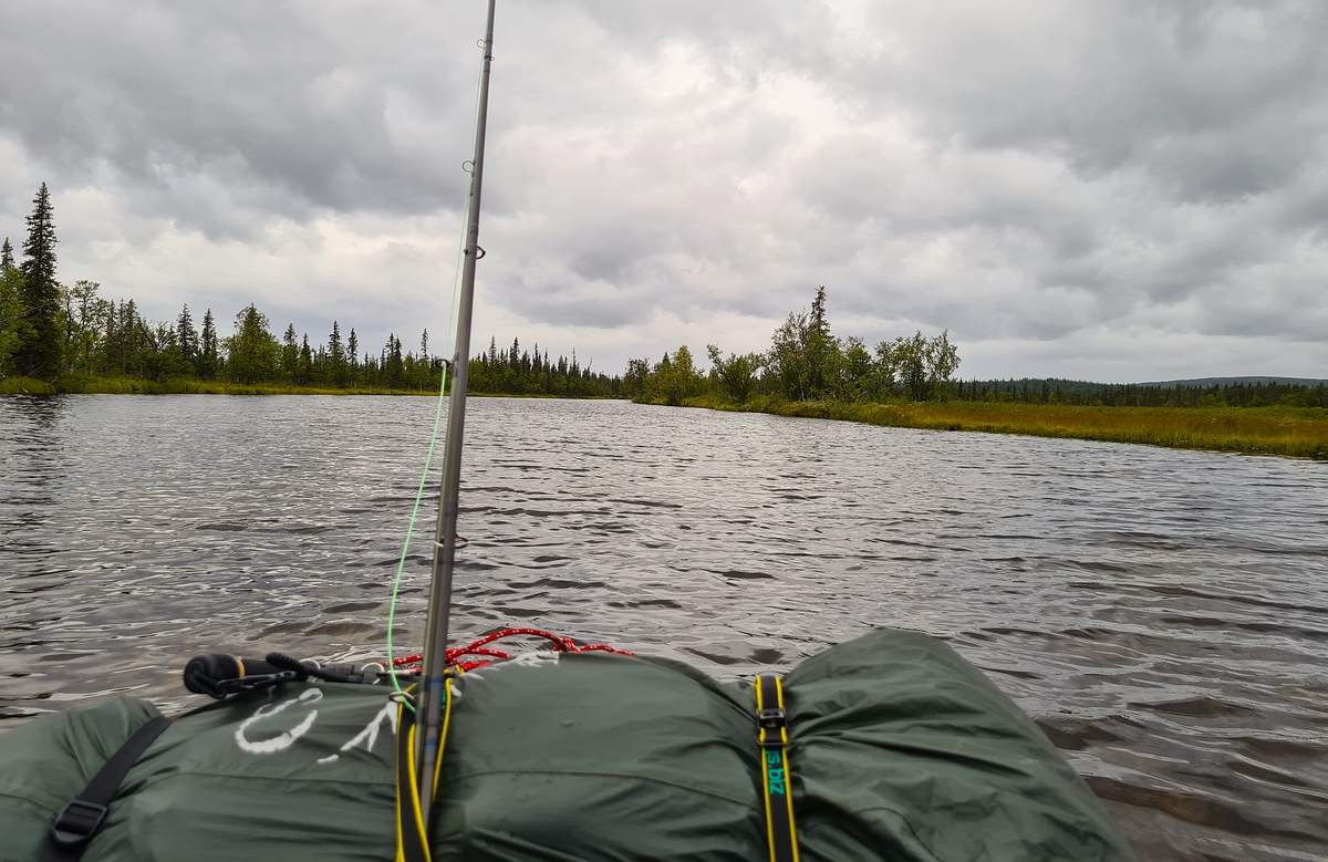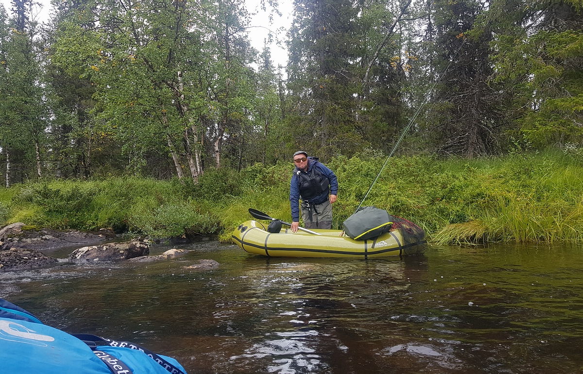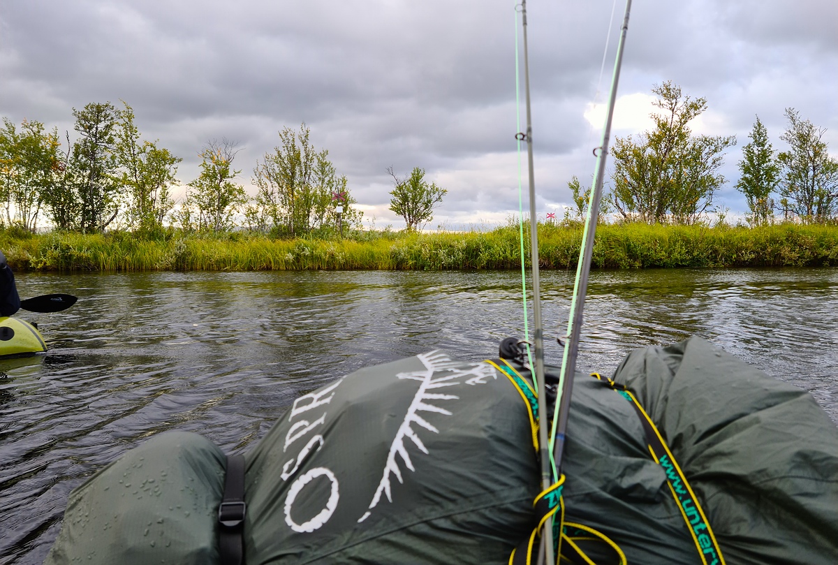 In der Nacht hatte sich wieder der Regen eingestellt. Da unser Zeltplatz leider unter einem Baum stand, kamen noch zusätzlich dicke Tropfen aus der Kiefer, die uns das Schlafen schwer machten. Am Morgen hörte der Regen zum Glück auf und nach einem kurzen Müslifrühstück ging es an den Fluss, um den Hechten nachzustellen. Sven konnte schon in den ersten Würfen seinen ersten Hecht fangen. Dieser hatte alte und neue Otterspuren hinter der Rückenflosse. Durch den vielen Regen war der Fluss angeschwollen und gefühlt nur noch vier Grad warm. Den Hechten war das wohl auf den Magen geschlagen und Sven konnte zwei vorsichtige Anfasser nicht verwandeln. Also bauten wir das Zelt ab, verzurrten unsere Rucksäcke auf den Packrafts und machten uns wieder auf den Weg. |