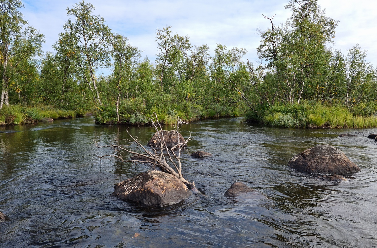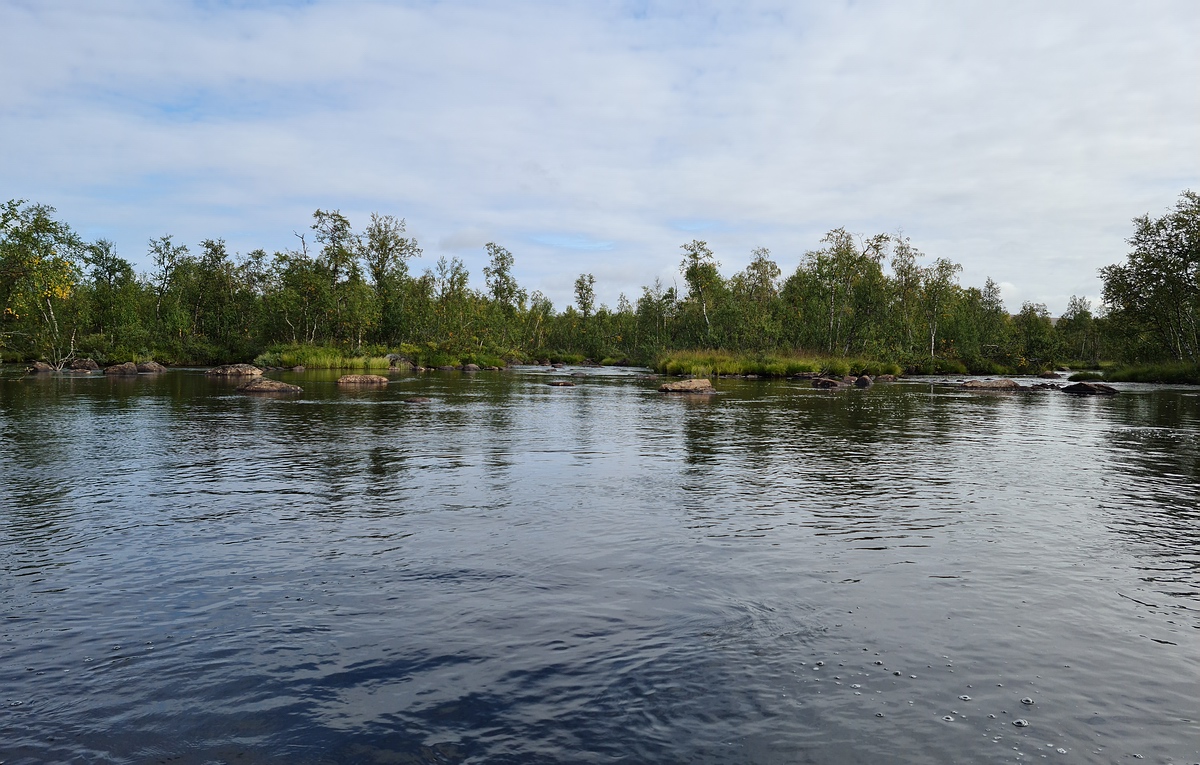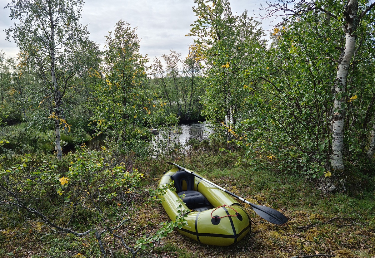 | Am Ende des Landweges waren wir richtig kaputt. Die Sonne brannte und wir schätzten die Temperatur auf 16°C und gefühlte 25°C. Wir waren uns auch nicht mehr so sicher, ob das wirklich eine Abkürzung war. Weiter ging es wieder mit dem Packraft an einer Sami Siedlung vorbei und mit leichtem Gegenwind über einen fünf Kilometer langen See. Nach dem See erreichten wir wieder schnelleres Wasser und fanden bei einer Rausche auch einen sehr guten Zeltplatz. |