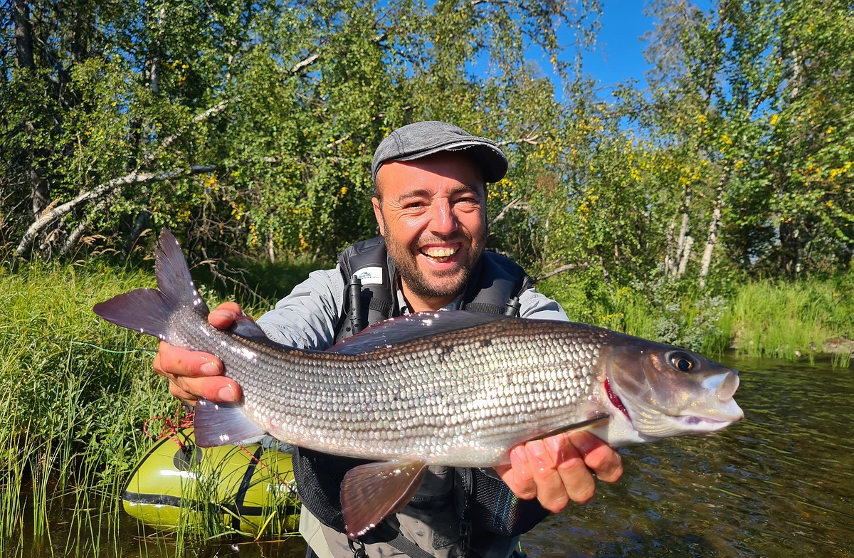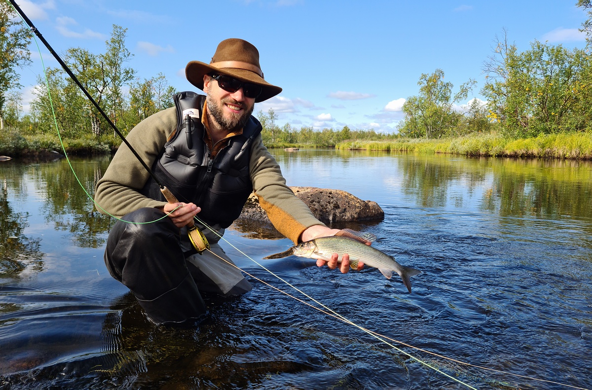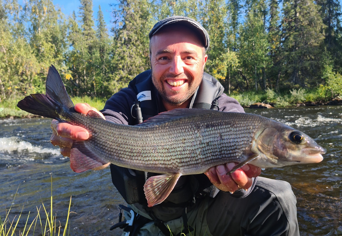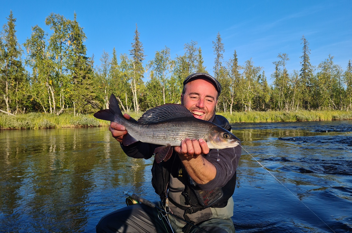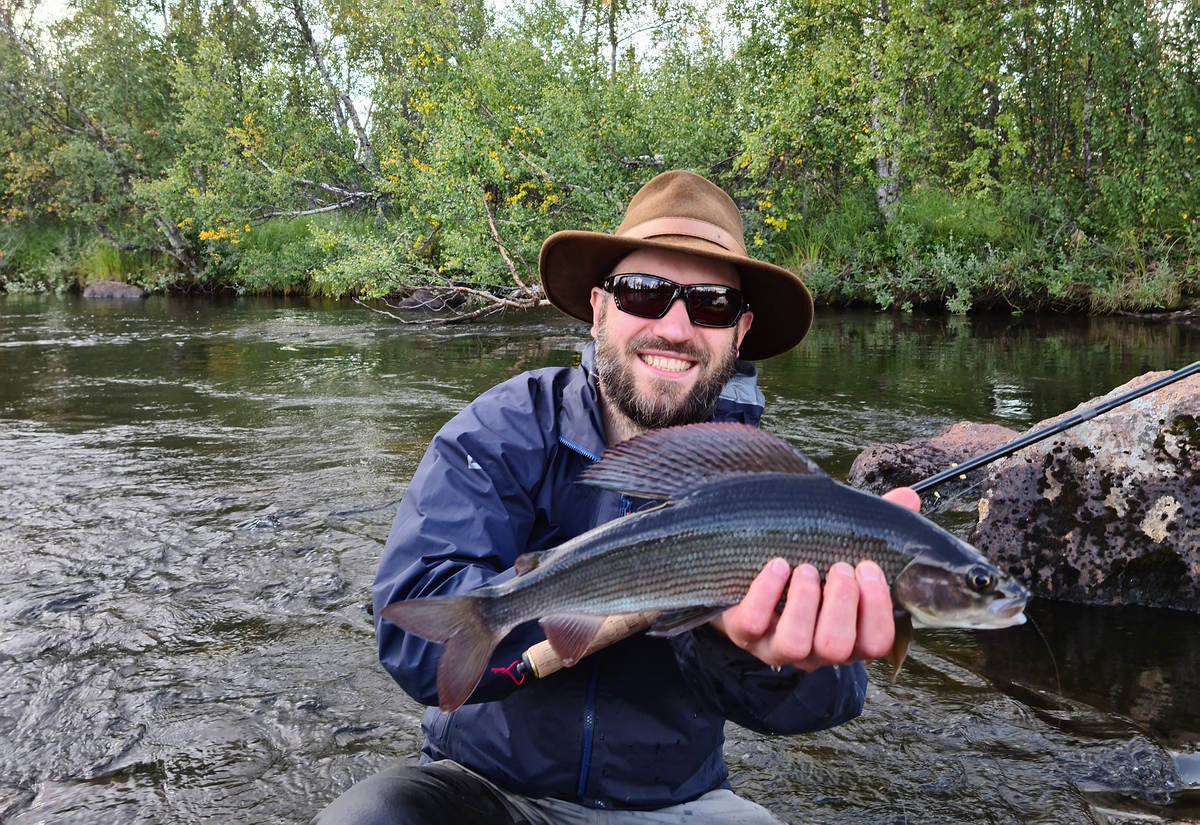 | Nachdem das Zelt stand, fischten wir uns den Fluss wieder hoch. Es war einfach unglaublich, wie viele Äschen in diesem Abschnitt waren. Wir konnten noch mehrere Ende 40er Äschen fangen. Fast jeder Wurf gab Fisch. Wir schätzen, dass wir an diesem Tag jeder um die 60 Äschen fangen konnte. Am Abend suchten wir in der Umgebung noch nach Pilzen fürs Abendbrot, fanden aber nur ein zerlegtes Rentier. Zum Glück war kein Fleisch mehr an den Knochen und wir konnten auf unserem Zeltplatz bleiben und mussten keine Sorge vor ungebetenen Gästen haben. Am Abend gab es Kartoffelpüree mit Äsche und Speck. Mehr als Happy über so einen Ausnahmetag schliefen wir glücklich ein. |